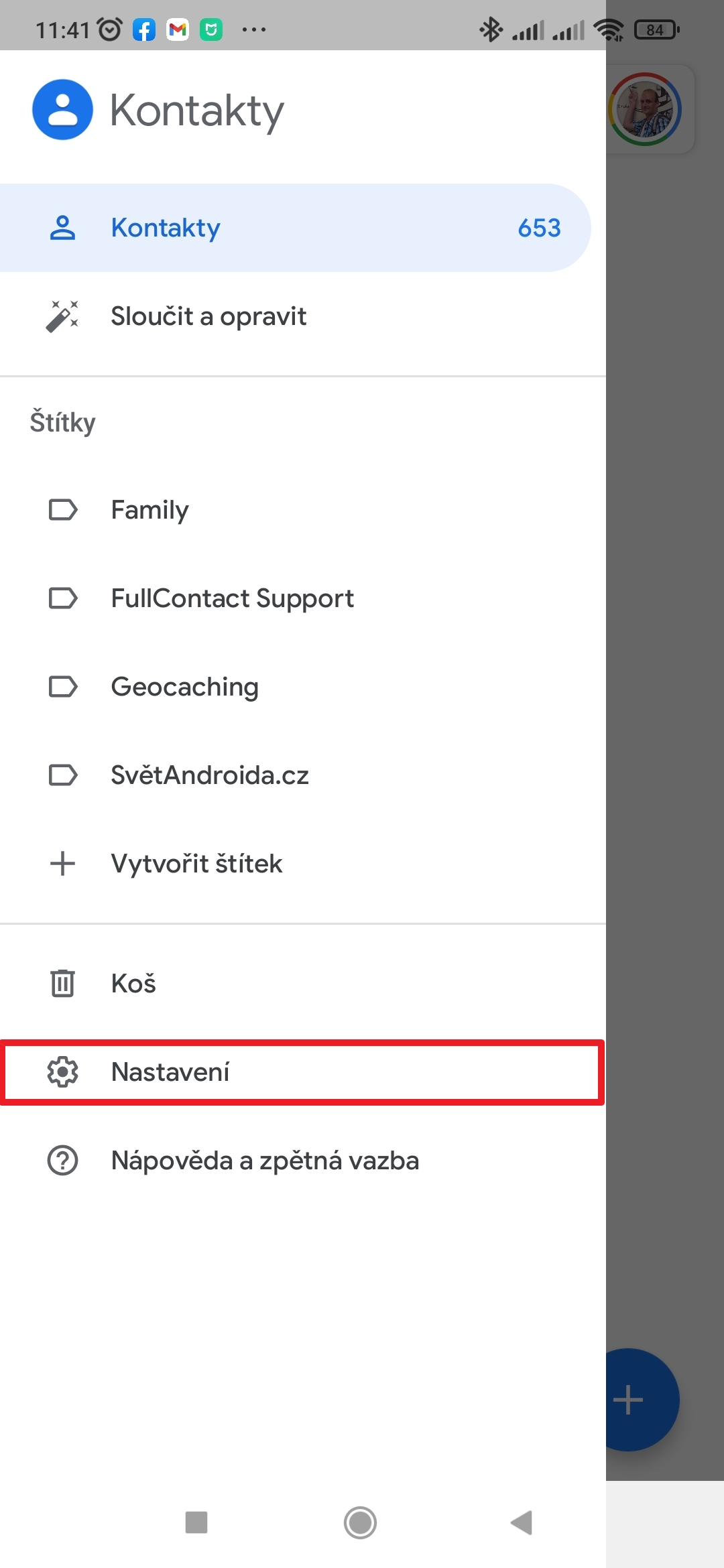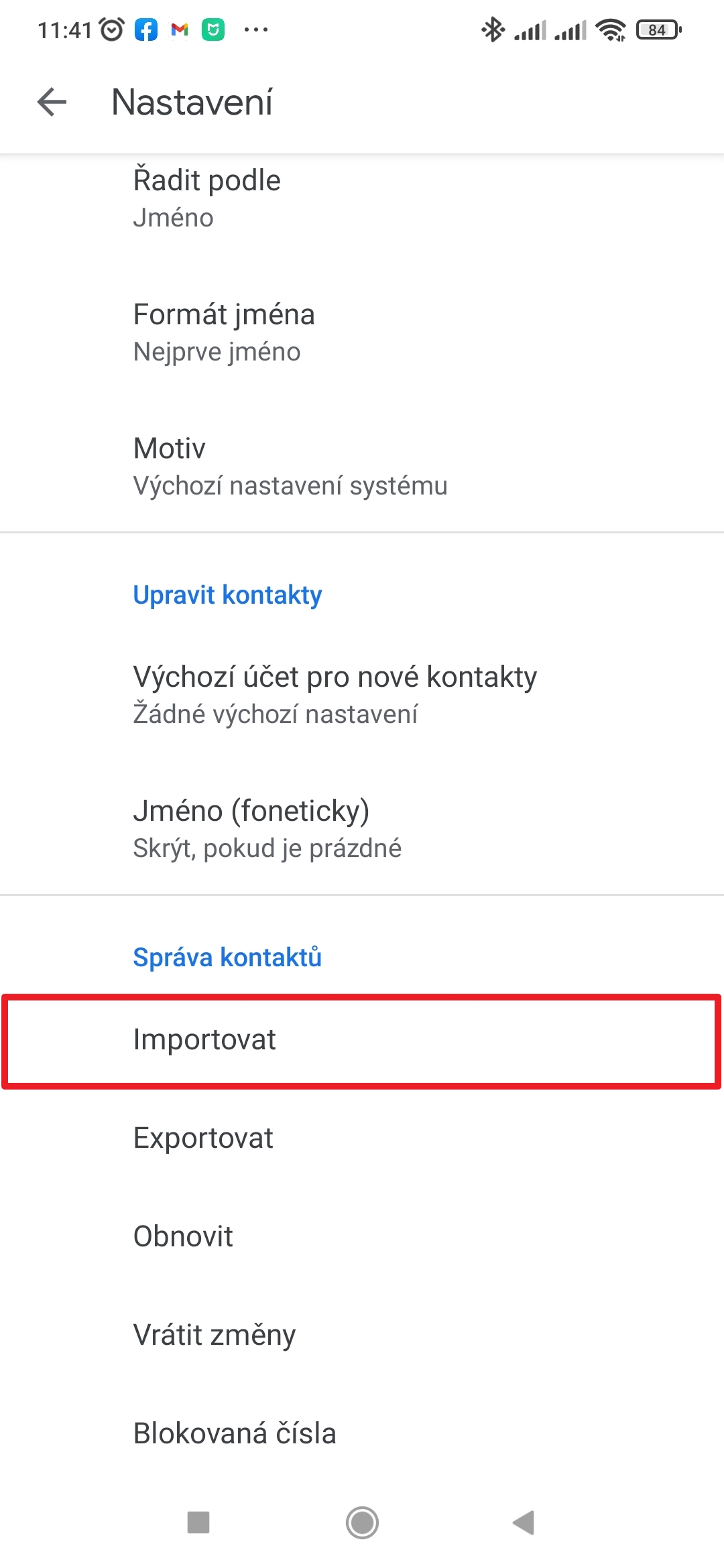 - V sekci Správa kontaktů zvolte Importovat.
