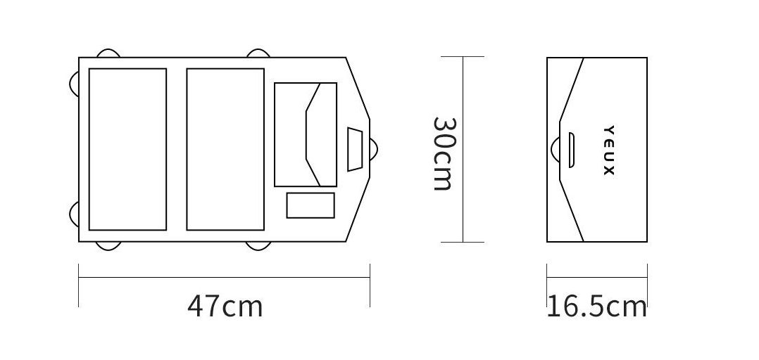Celé zařízení lze poskládat do praktické taštičky o rozměrech 30 × 16,5 centimetrů. V rozloženém stavu lze panel pomocí karabin, které jsou součástí balení, připevnit například na batoh či na střechu stanu – rozměry jsou pak 30 × 47 centimetrů.