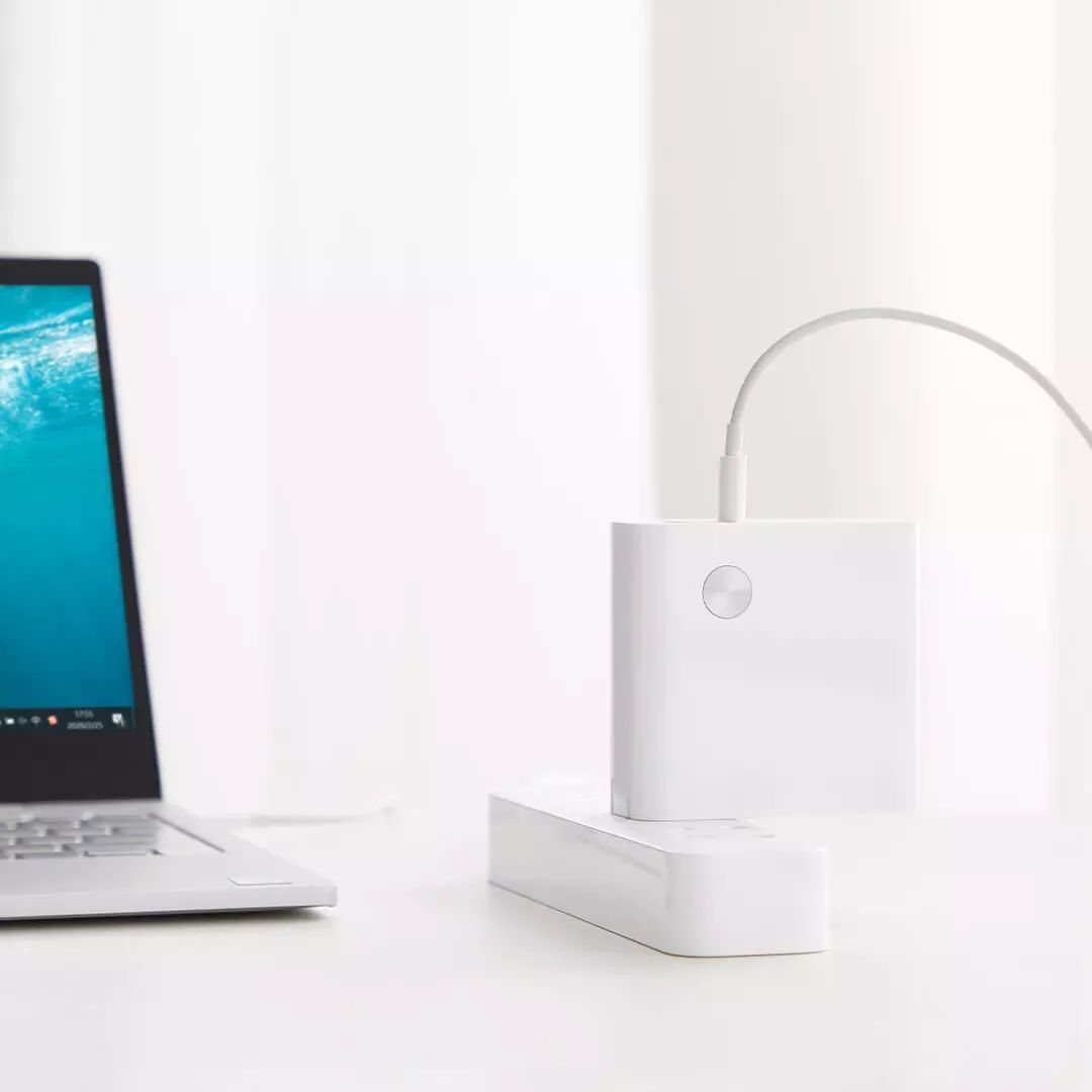 Xiaomi 50W 2-in-1 Power Bank má rozměry 77,6 × 73,3 × 31,6 milimetrů, je vyrobena z bílého plastu a na její zadní straně najdeme dva konektory: USB-A s maximálním výkonem 27 W a USB-C s výkonem až 45 W. Kromě nich jsou zde přítomny také čtyři bílé LED, sloužící k indikaci stavu nabíjení integrovaného akumulátoru.