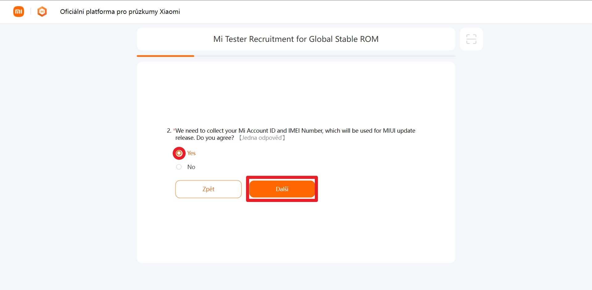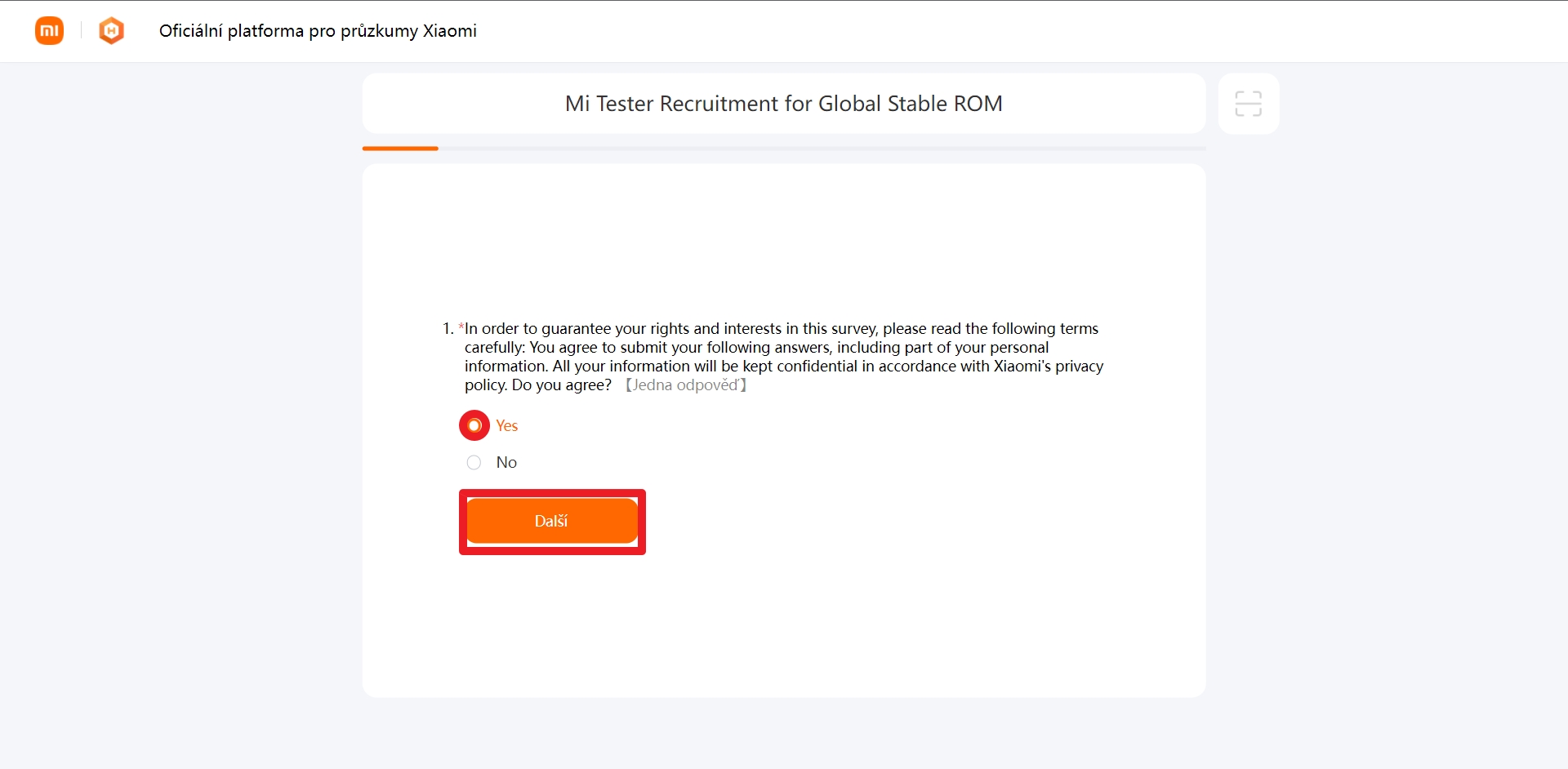 V první otázce vyjadřujete souhlas s poskytnutím informací, spočívajícím v zodpovězení otázek, včetně soukromých. Xiaomi bude tyto údaje považovat za důvěrné v souladu se svými podmínkami ochrany soukromí. Abyste mohli pokračovat, musíte zvolit odpověď Yes a stisknout tlačítko Další.