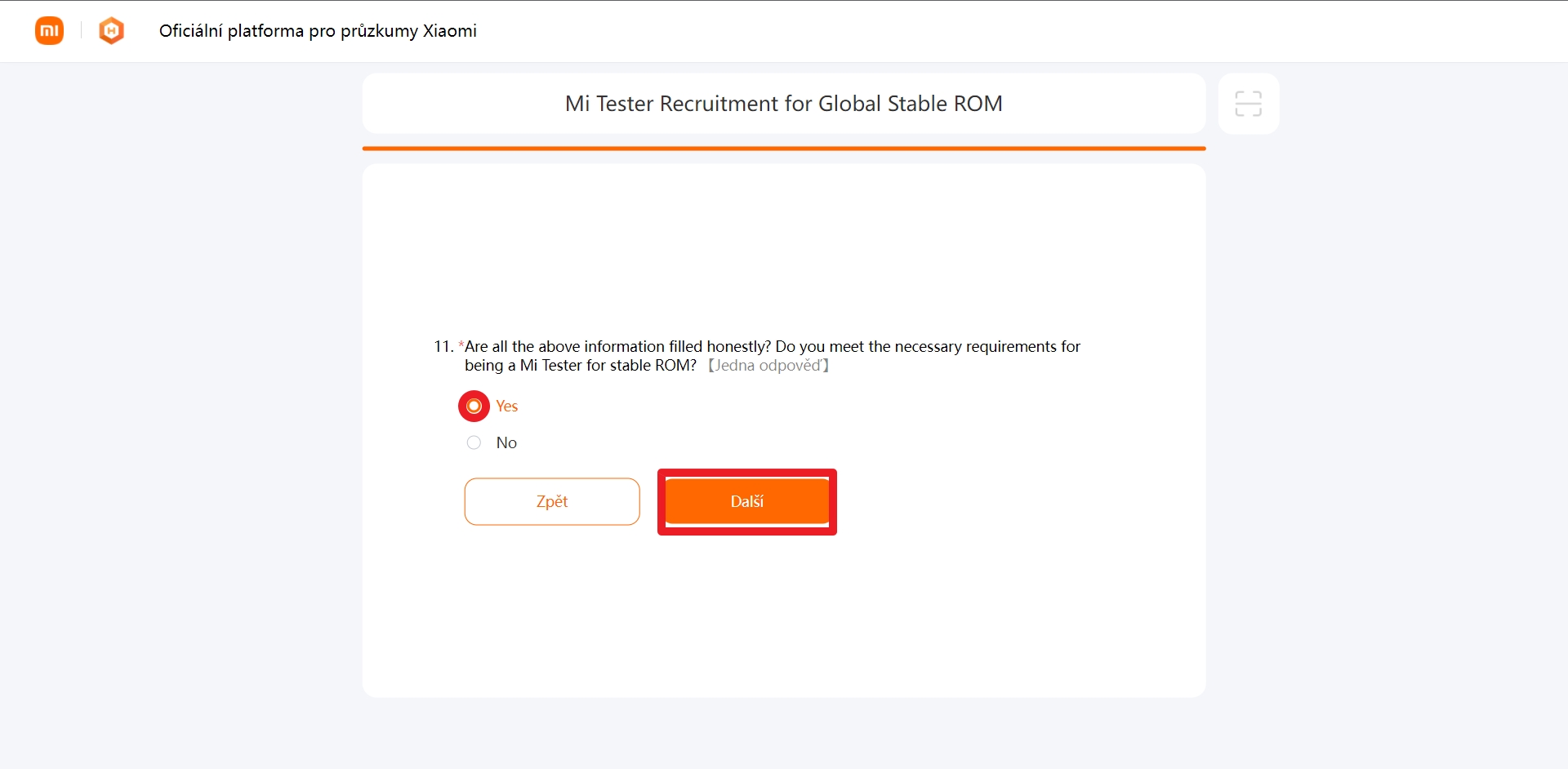 V posledním kroku se Xiaomi ptá, zda jste veškeré odpovědi vyplnili pravdivě a jestli splňujete veškeré podmínky pro to, abyste se stali beta testerem MIUI. Samozřejmě odpovězte Yes a stiskněte tlačítko Další.