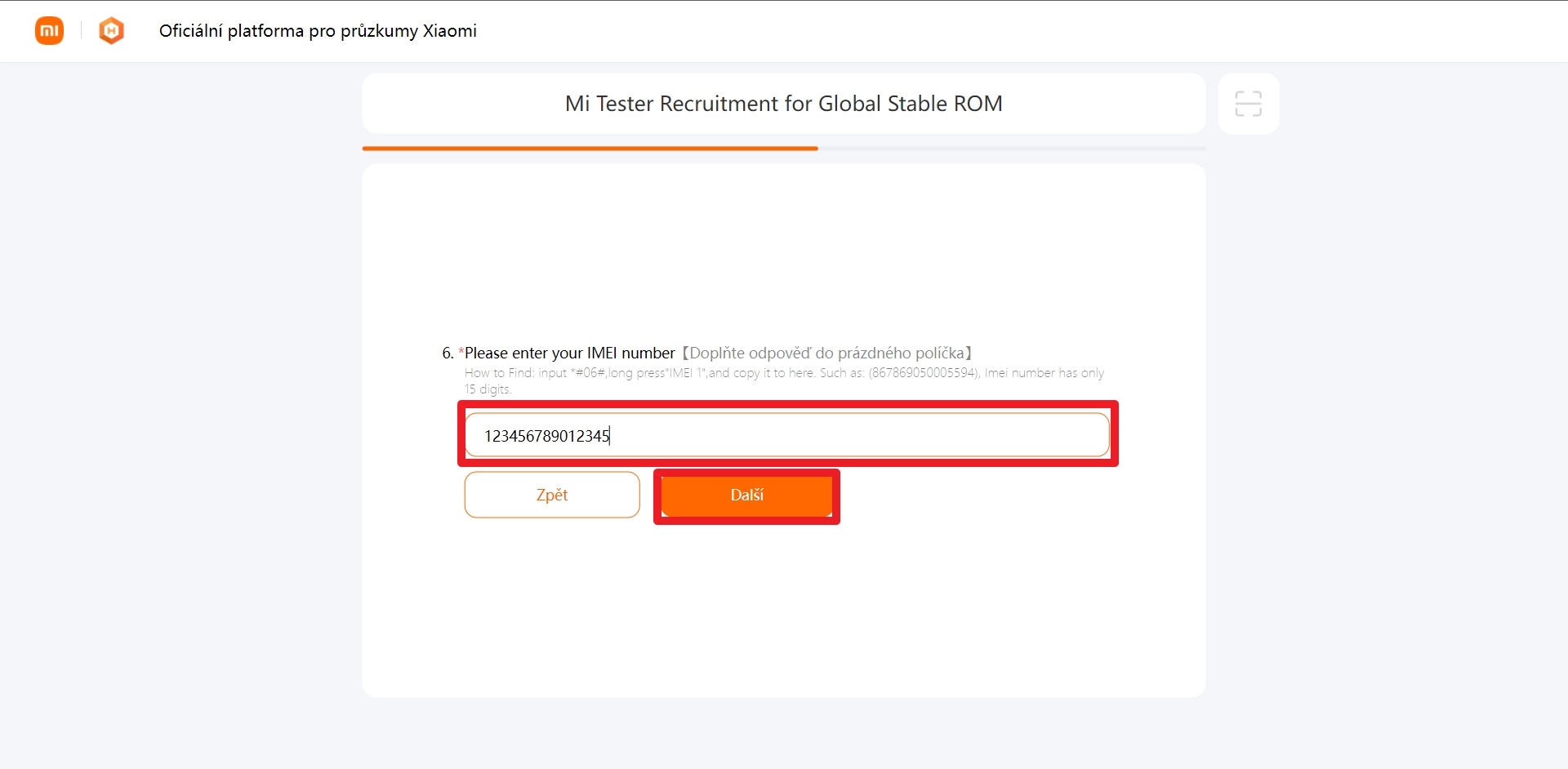 V dalším kroku vás Xiaomi informuje, že bude potřebovat identifikační číslo vašeho účtu Xiaomi a IMEI telefonu. Tyto dva údaje jsou nezbytné k tomu, aby váš telefon – v případě, že budete vybráni jako beta testeři – obdrží aktualizaci na testovací sestavení MIUI 13. Opět tedy zvolte jako odpověď Yes a pokračujte tlačítkem Další.