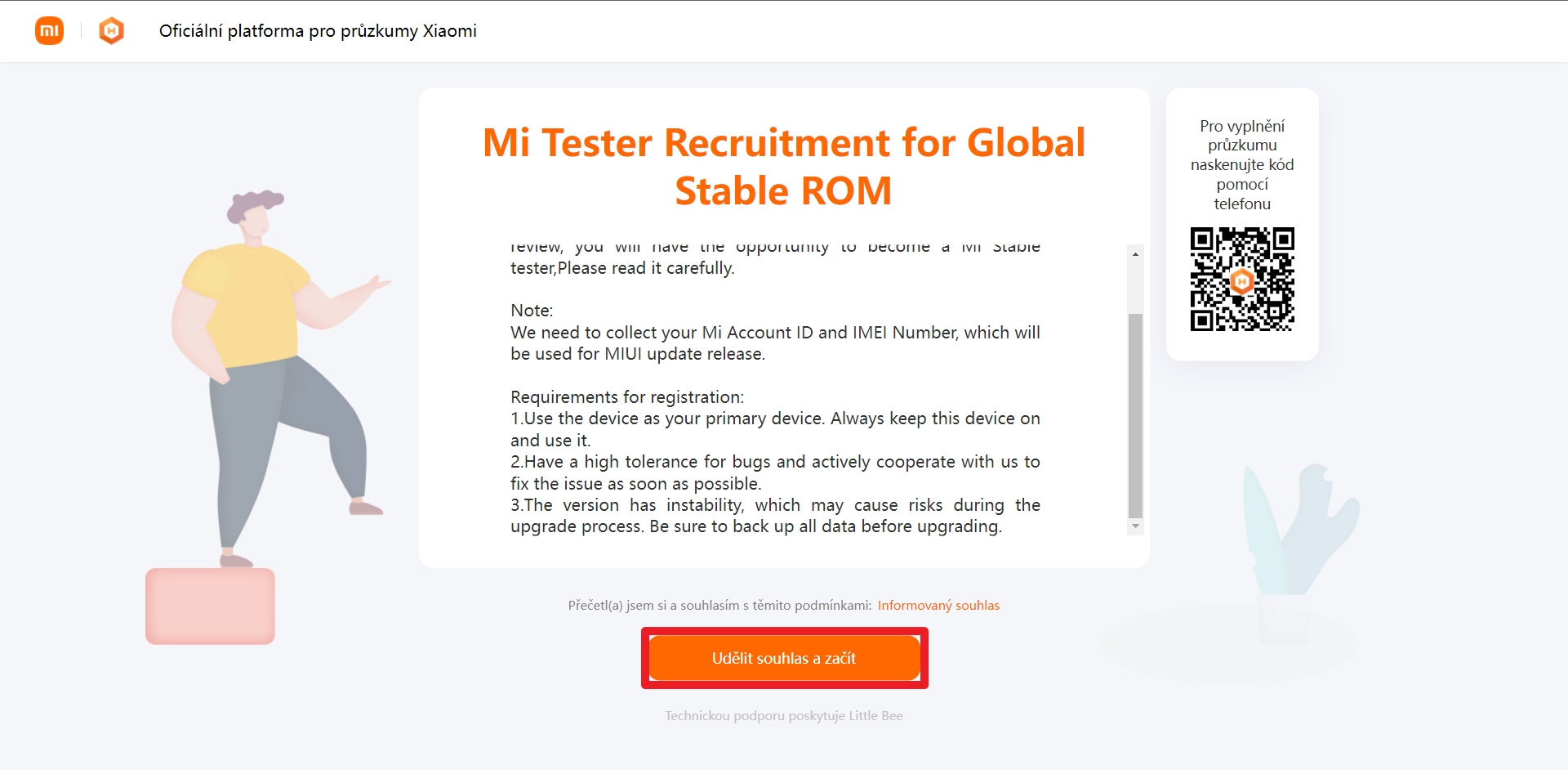 Pokud tyto požadavky splňujete a chcete si vyzkoušet MIUI 13 mezi prvními, řekneme vám, jak se přihlásit. Kliknutím sem vstoupíme na stránku pro podání žádosti. Jako první budete muset potvrdit souhlas s podmínkami. Píše se v nich, že vyplníte všechny údaje podle skutečnosti a Xiaomi bude shromažďovat vaše Xiaomi ID a IMEI.