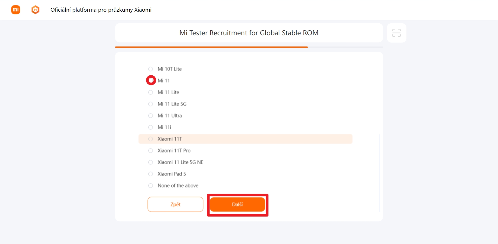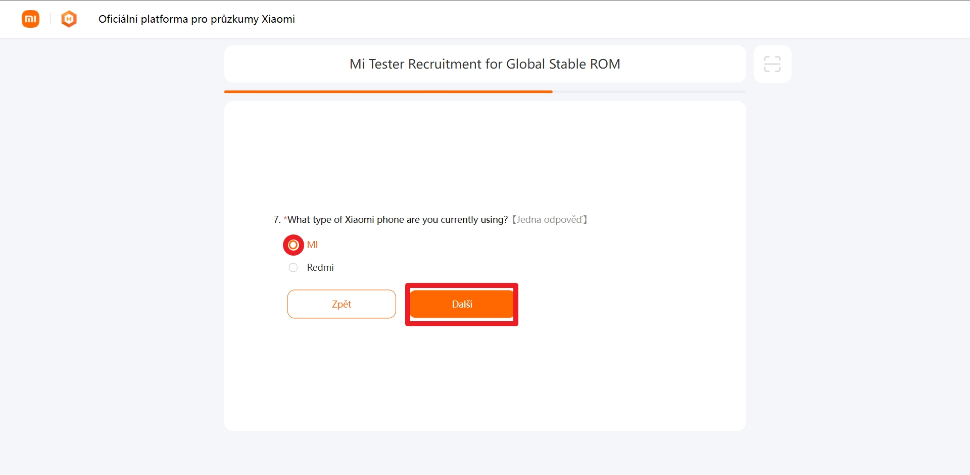 V sedmém kroku je vaším úkolem zvolit, jaký telefon aktuálně používáte. Pokud je to Xiaomi, volte odpověď Mi (přestože se slovo Mi v názvu vašeho telefonu nemusí vyskytovat), v případě telefonů Redmi volte druhou možnost. Pokračujte stisknutím tlačítka Další.