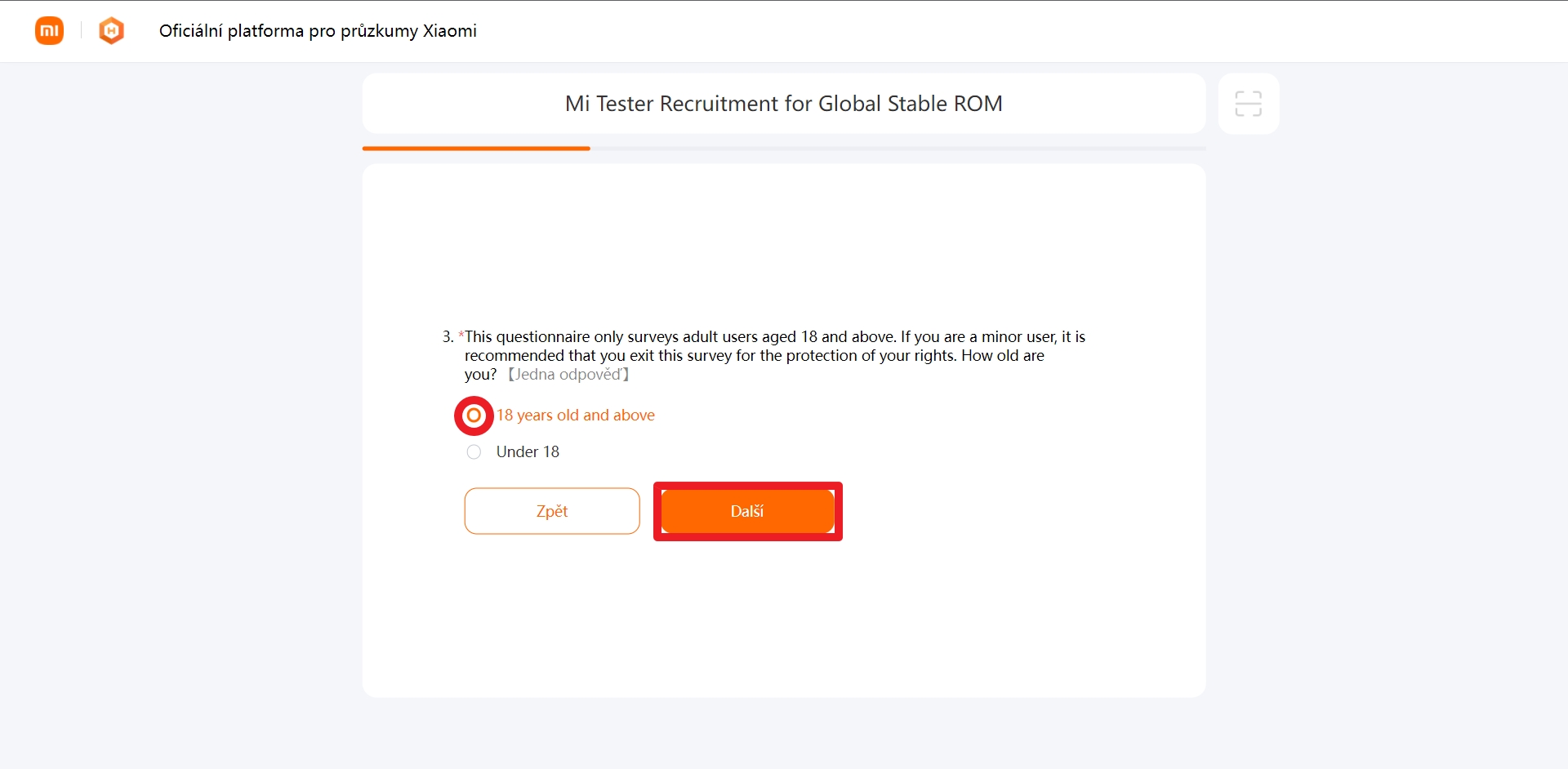 Ve třetím kroku musíte zvolit, zda jste starší osmnácti let, což je jedna ze zásadních podmínek vstupu do testovacího programu Mi Pilot. Zvolte tedy první možnost – 18 years and above – a pokračujte klepnutím na tlačítko Další.