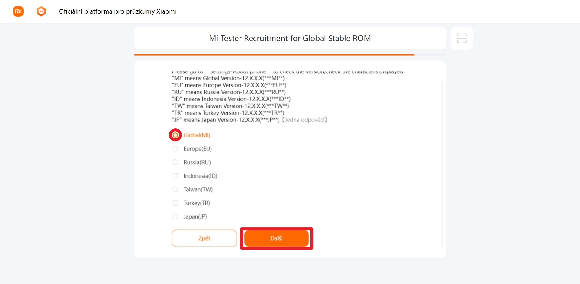 V dalším kroku musíte odpovědět na otázku, jakou verzi ROM nyní používáte. Tuto informaci najdete v Nastavení-O telefonu, kde vás bude zajímat položka Verze MIUI, konkrétně čtvrté a páté písmeno za číslem verze. Nejčastěji to bude MI, nebo EU. Zvolte odpověď dle skutečnosti a pokračujte stiskem Další.