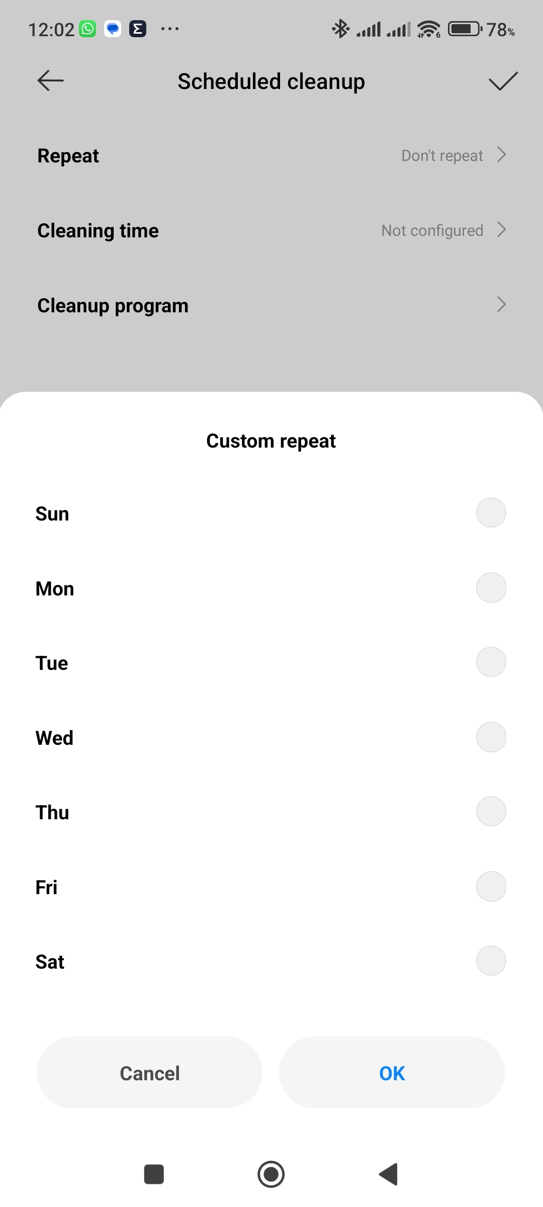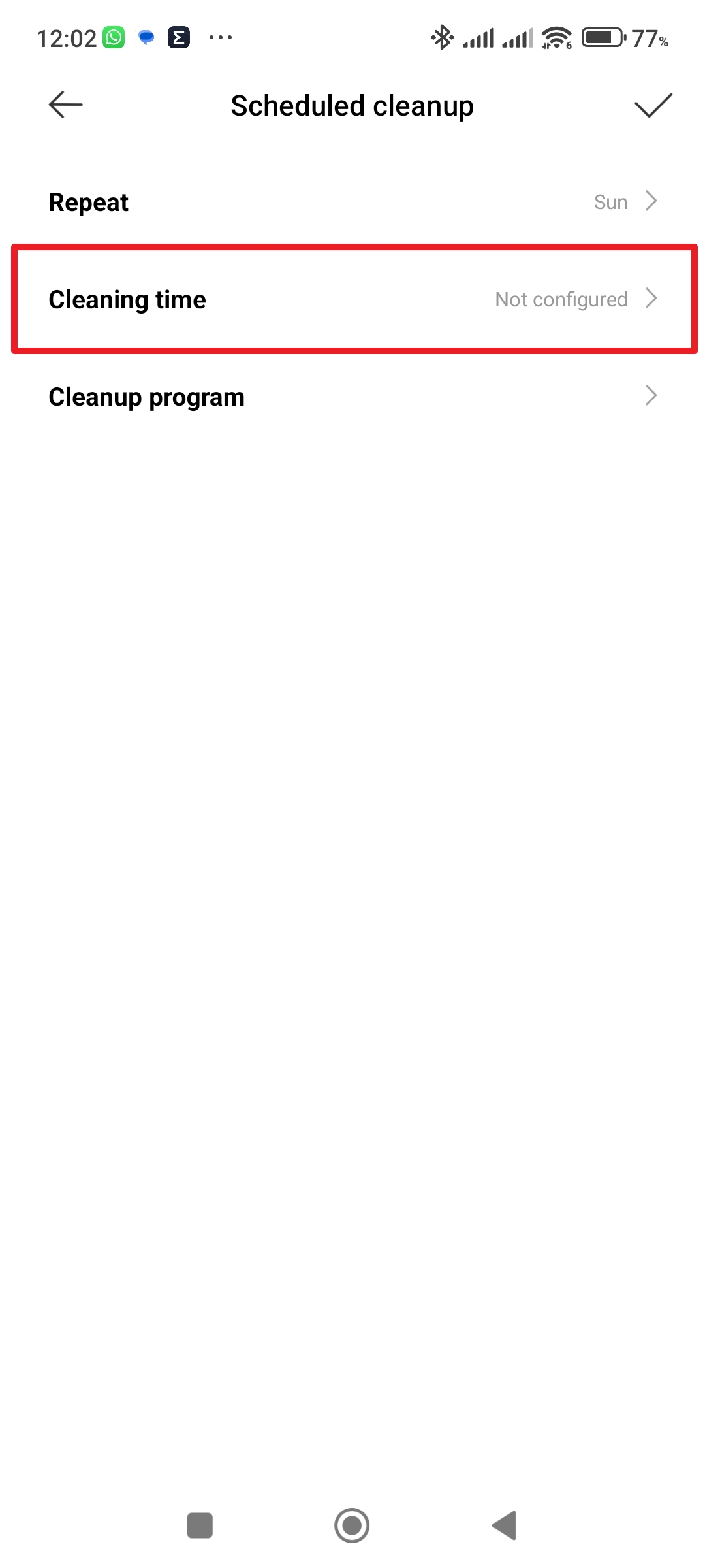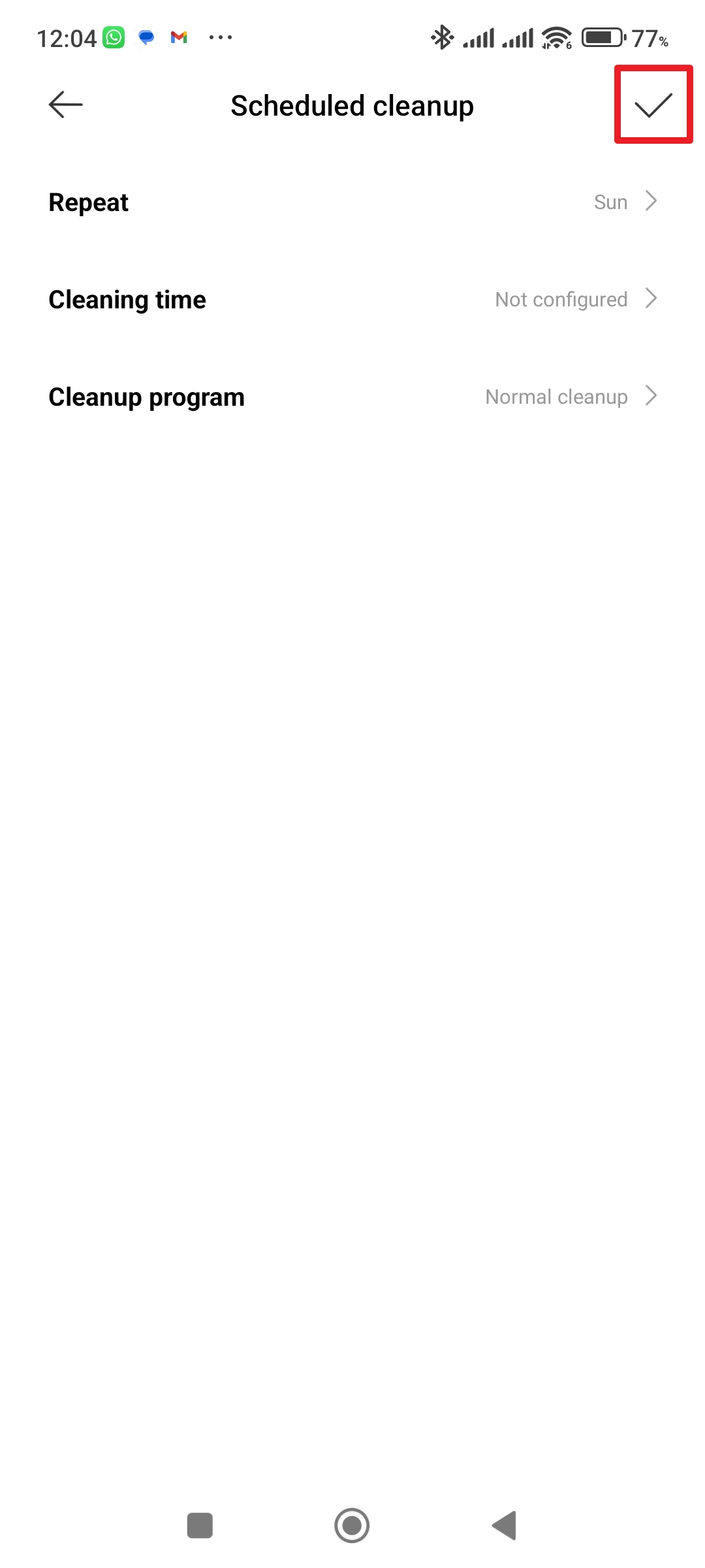 Pokračujte do sekce Scheduled cleanup Klepněte na tlačítko plus Kdy se má úklid opakovat Zvolte dny úklidu - V sekci Cleaning time nastavte čas zahájení úklidu.