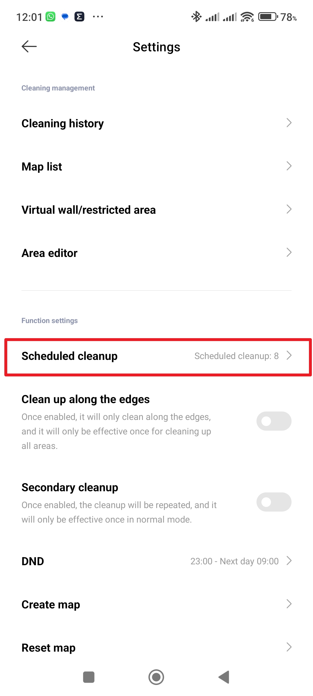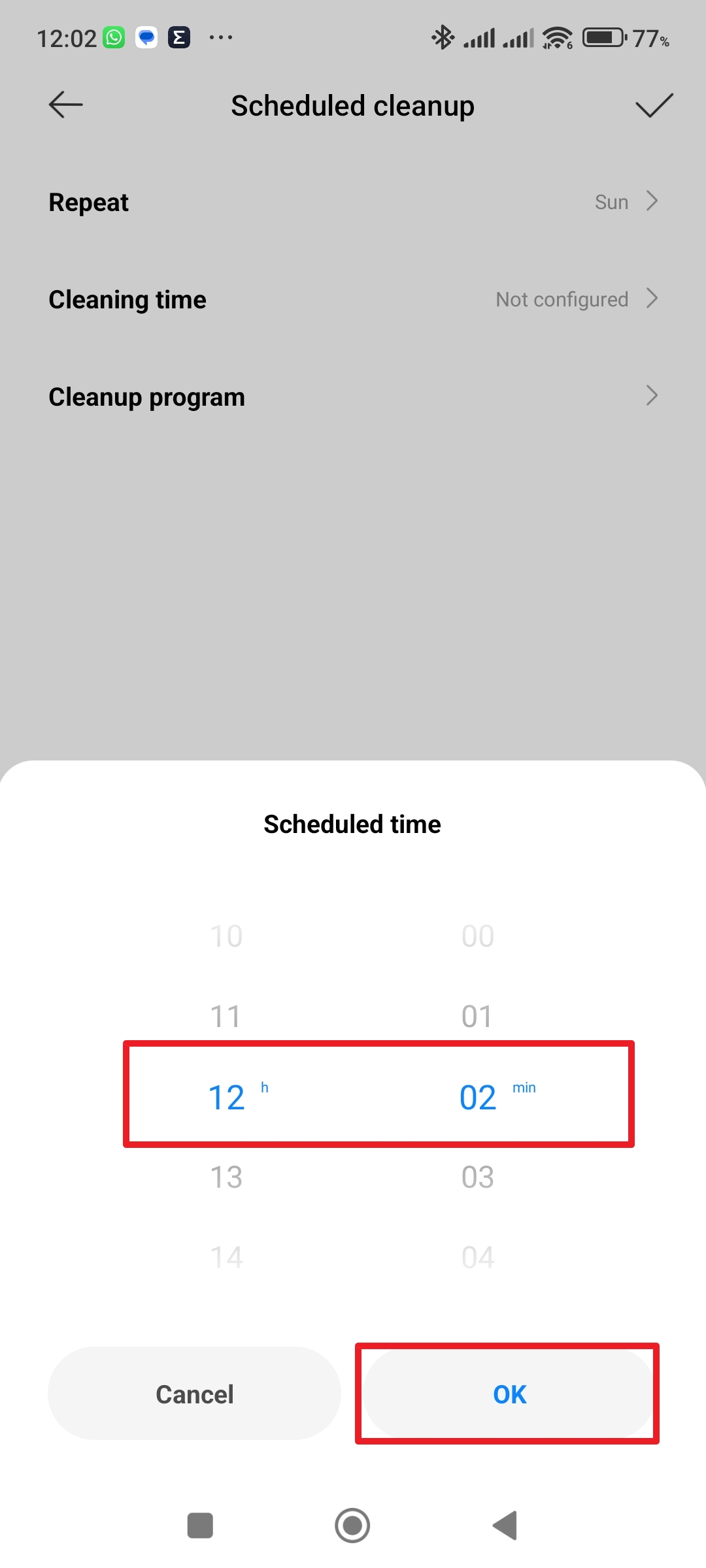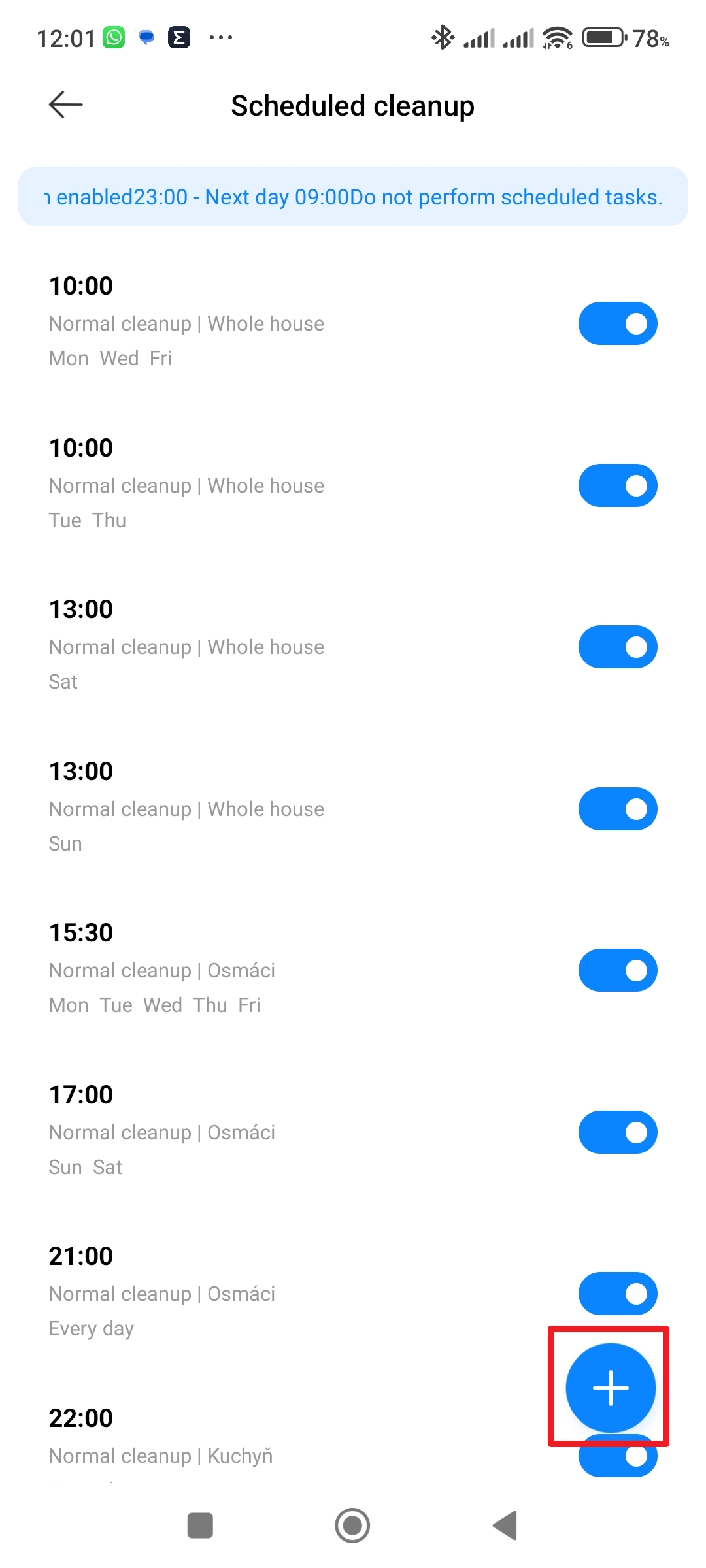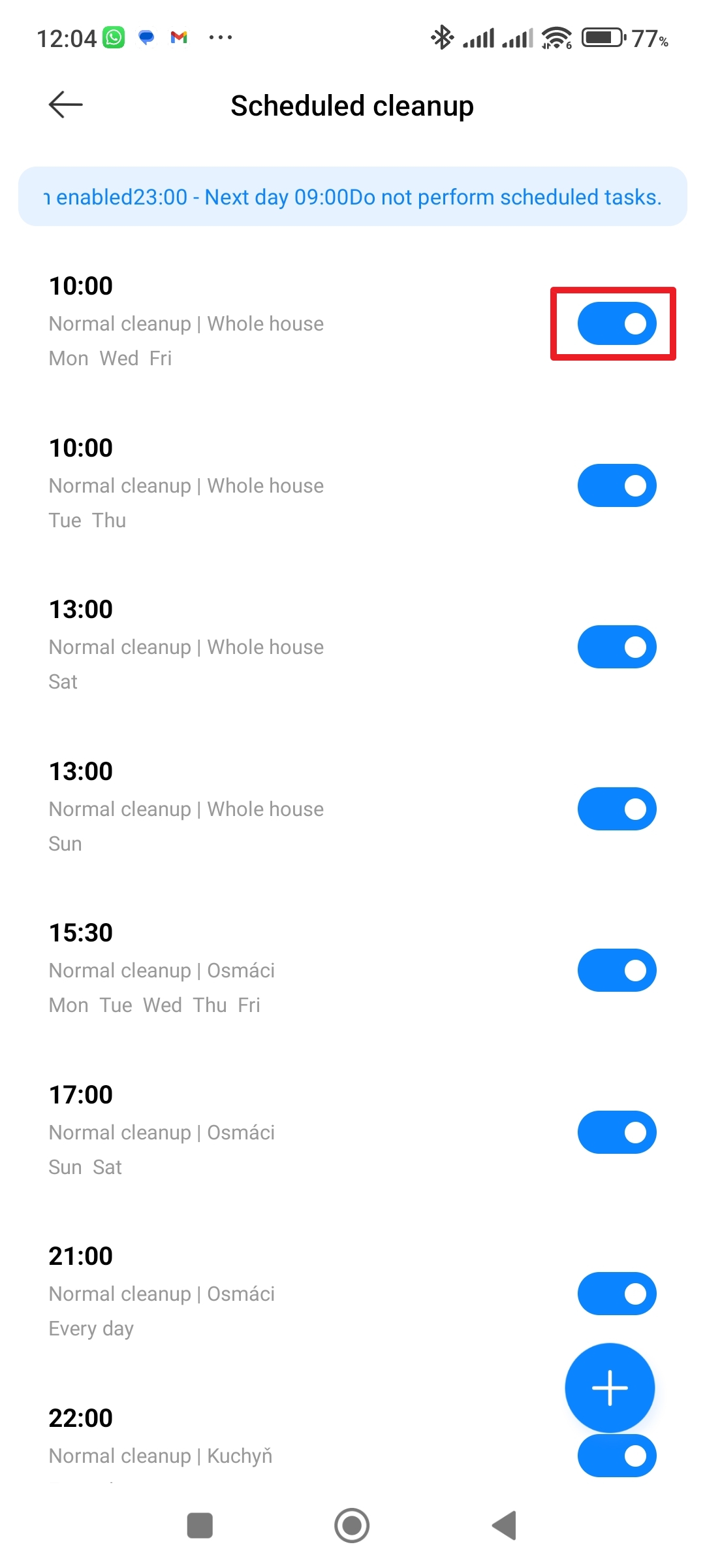 Pokračujte do sekce Scheduled cleanup Klepněte na tlačítko plus Kdy se má úklid opakovat Zvolte dny úklidu - V sekci Cleaning time nastavte čas zahájení úklidu.