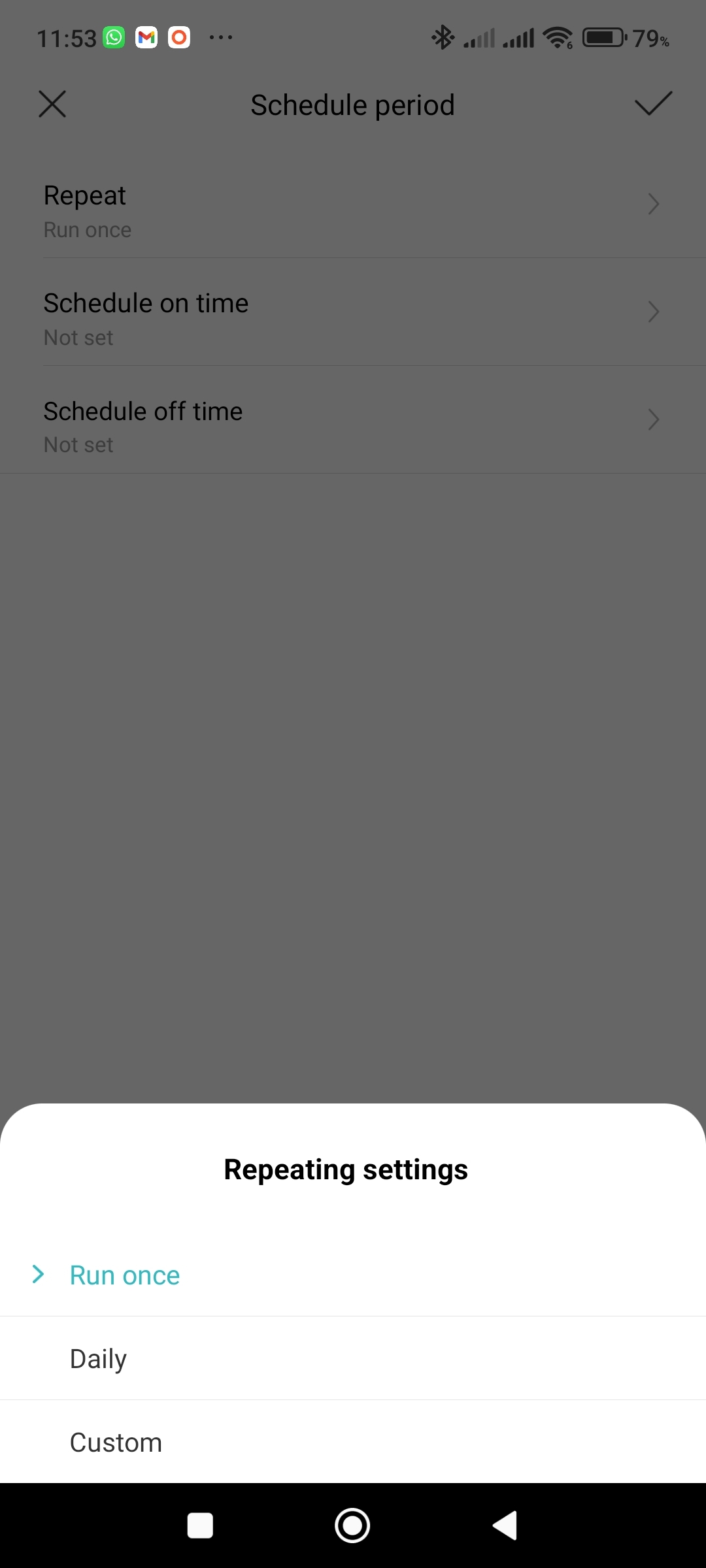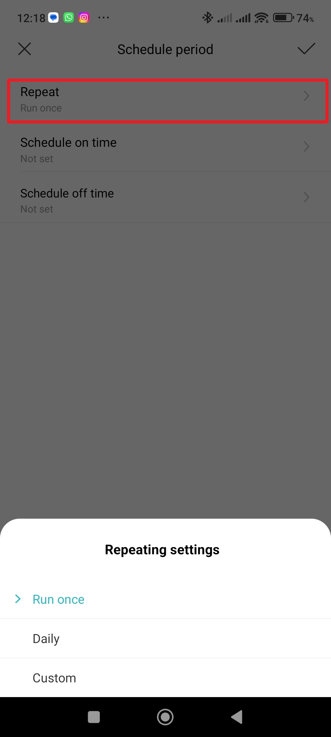 - Repeat – opakování automatického rozsvěcení, respektive zhasínání (Run once znamená pouze jednou, Daily každý den v uvedeném časem a Custom ve zvolené dny).