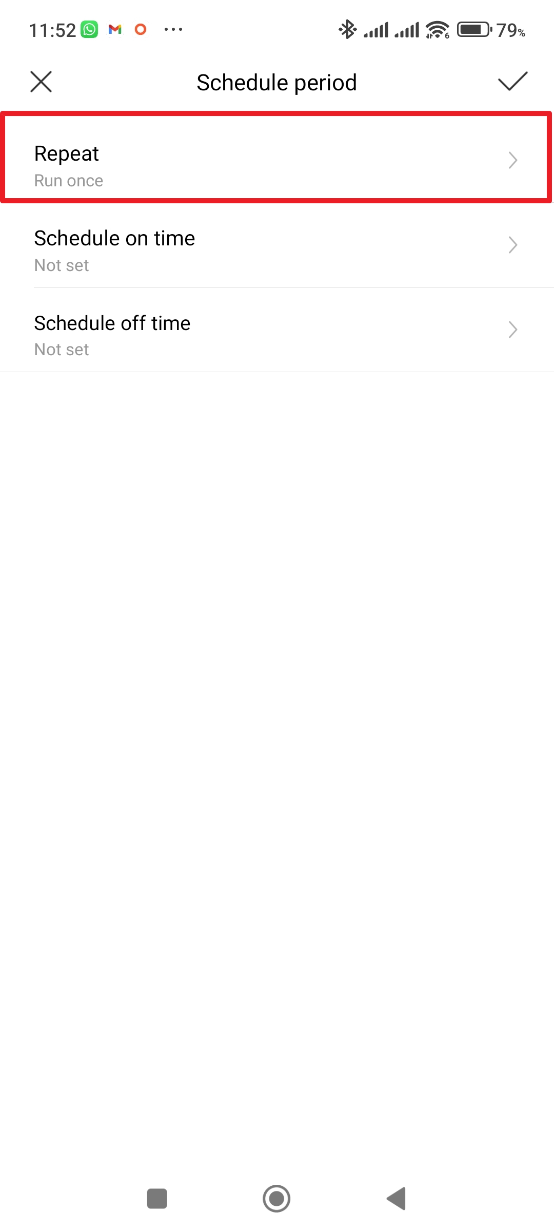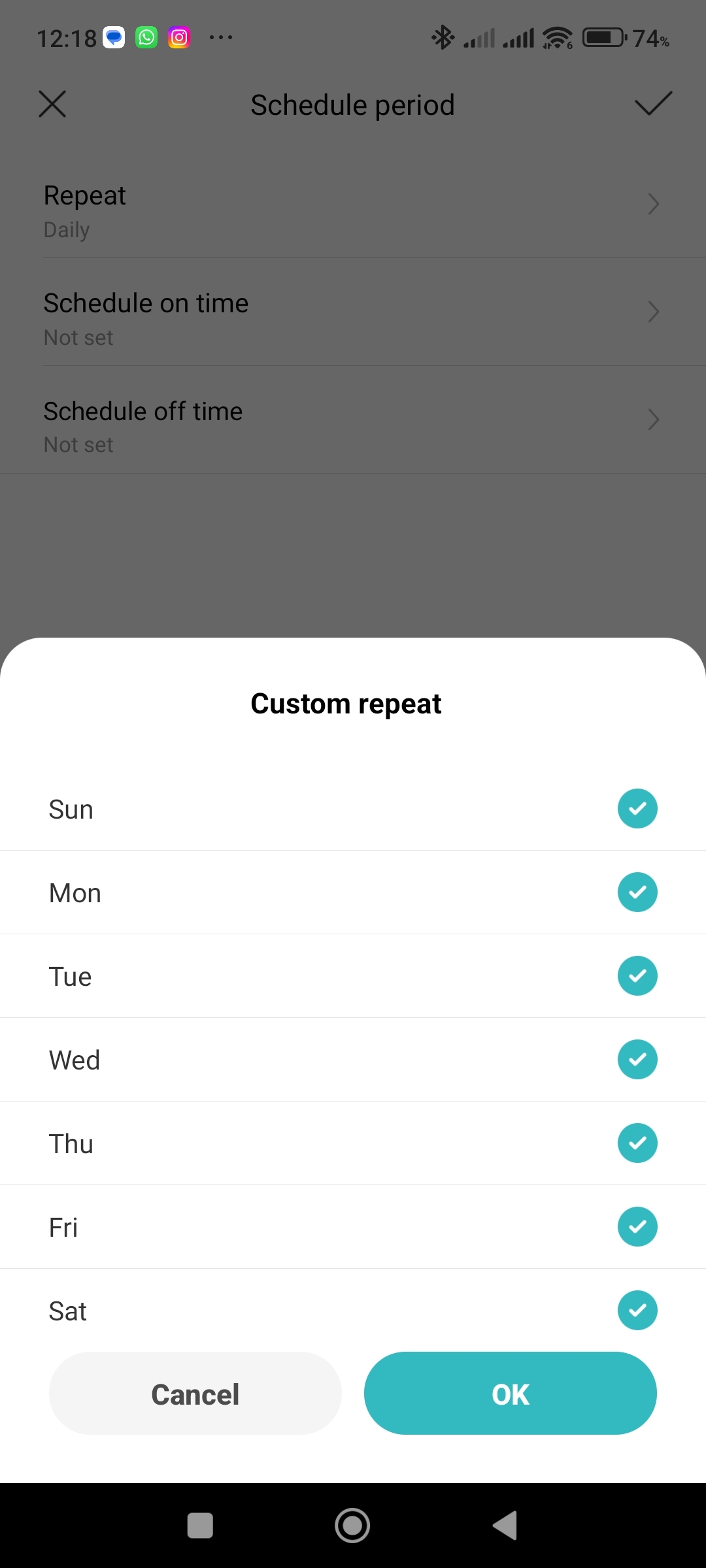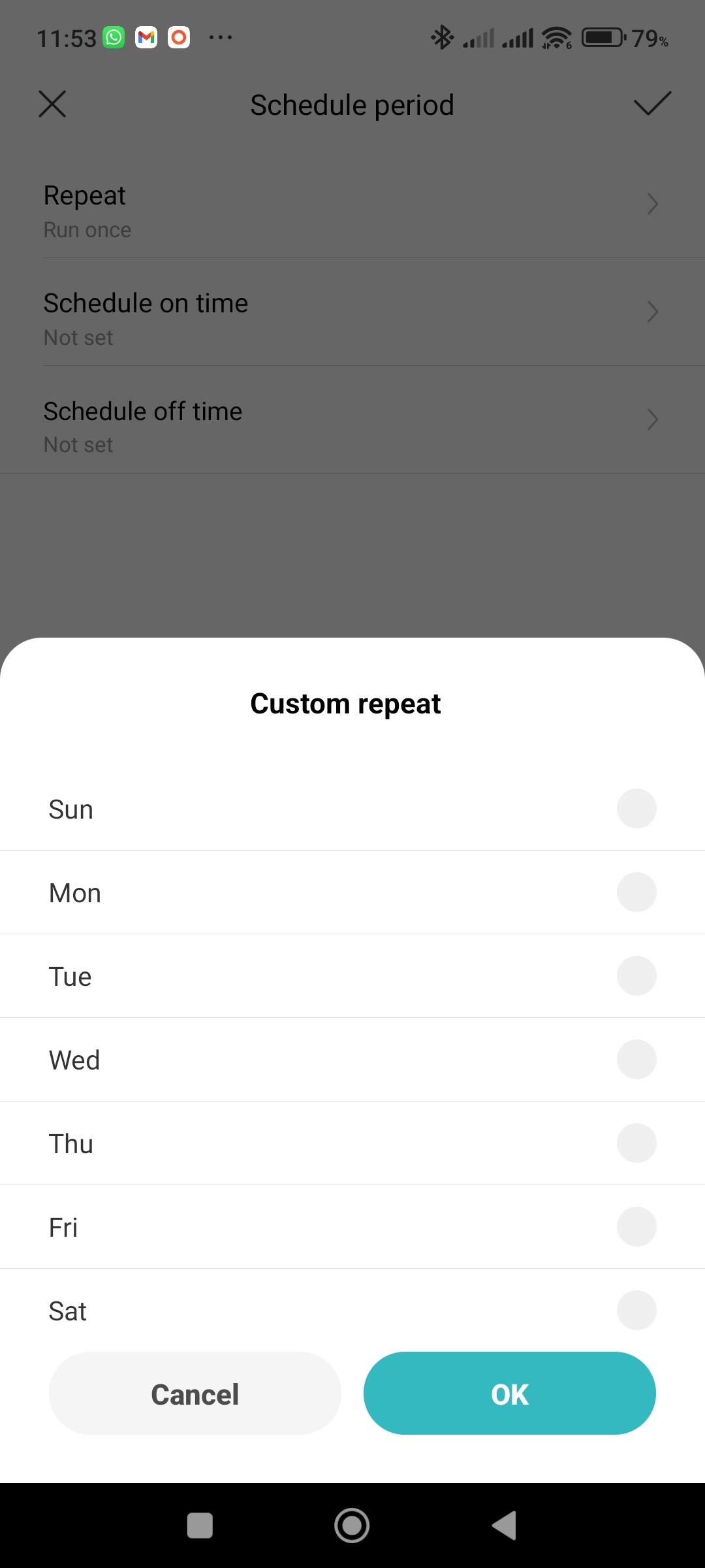 Klepněte na Repeat Zvolte, jak často se má zvolené nastavení opakovat Nastavte čas, kdy se má čistička vypnout, nebo zapnout Potvrďte nastavení tlačítkem OK - V sekci Then klepněte na Add.