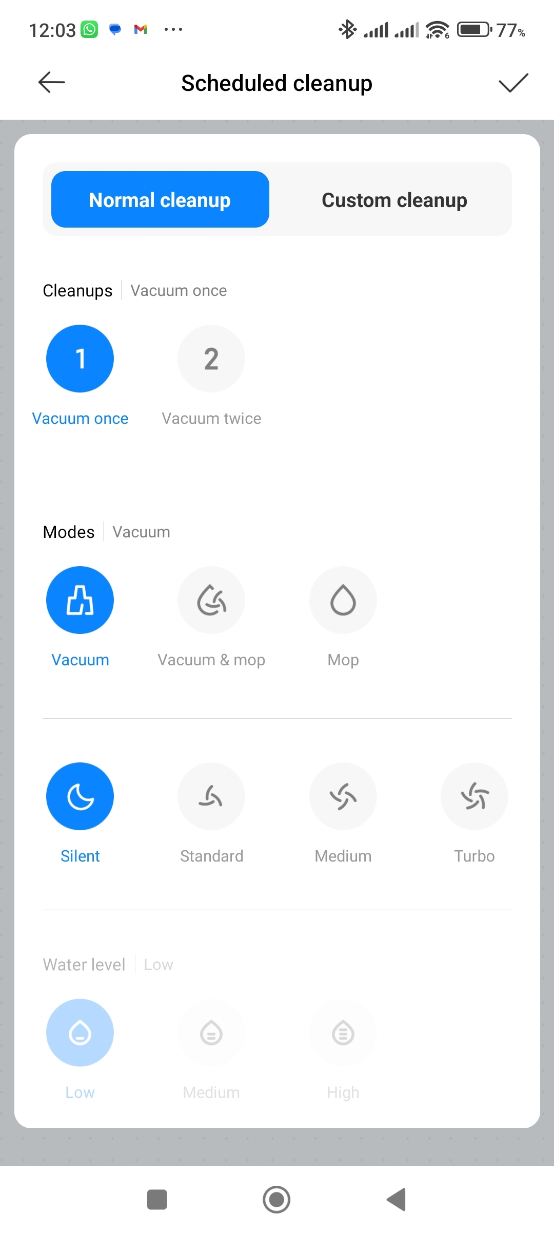 - U pokročilejších vysavačů můžete v sekci Cleanup program nastavit další podrobnosti úklidu – například které místnosti si přejete uklidit, zda se má vysávat, vytírat, nebo obojí a jakou intenzitou.