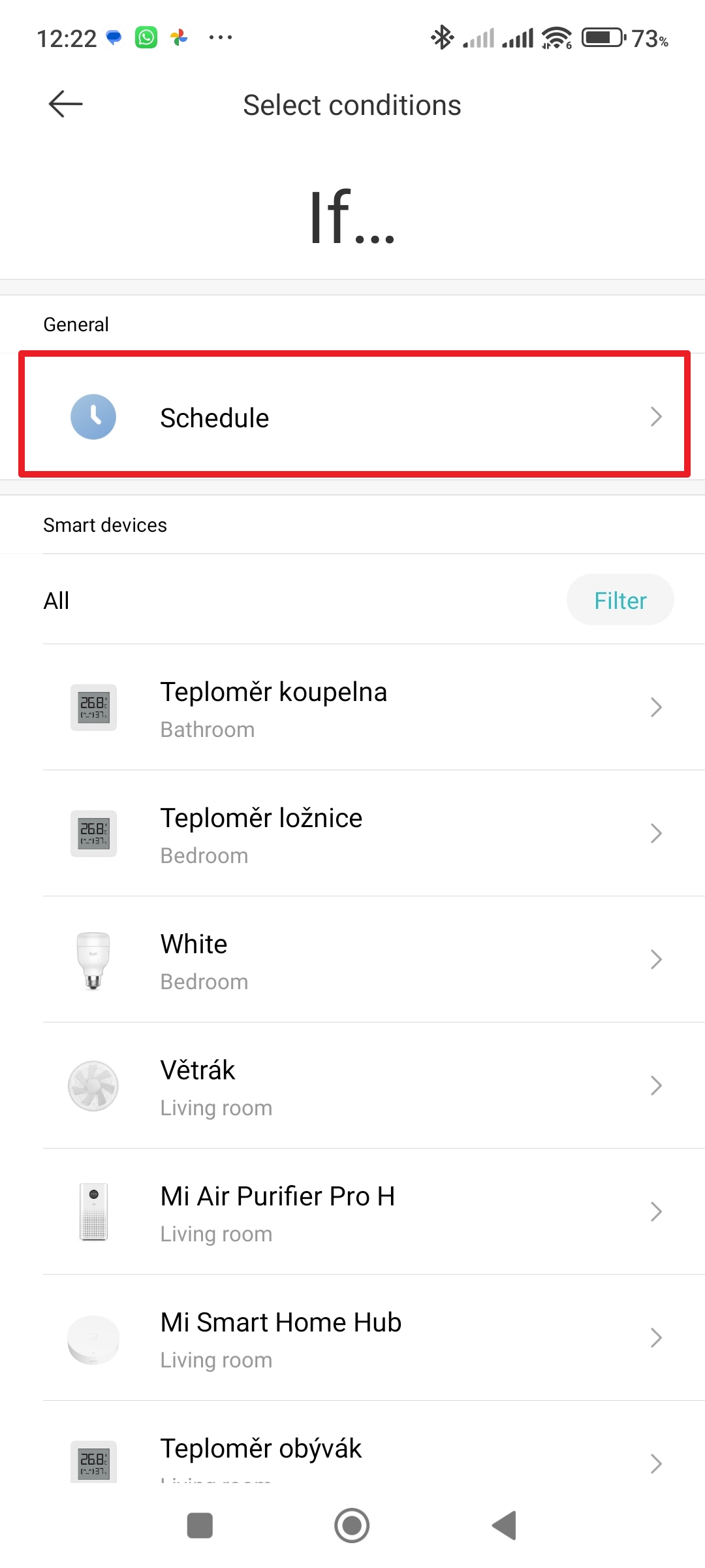 Otevřete aplikaci Mi Home Otevřete příslušnou žárovku Klepněte na tři tečky - Přejděte do sekce Schedules.