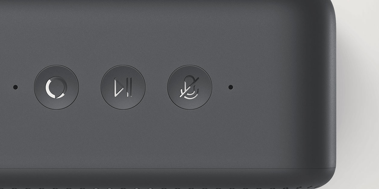Na horní straně přístroje se nacházejí tři tlačítka: pro vyvolání akce (probuzení/přerušení/zastavení Alexy), spuštění/pozastavení přehrávání a vypnutí mikrofonů. Po jejich stranách pak jsou dva mikrofony určené pro komunikaci s hlasovým asistentem.