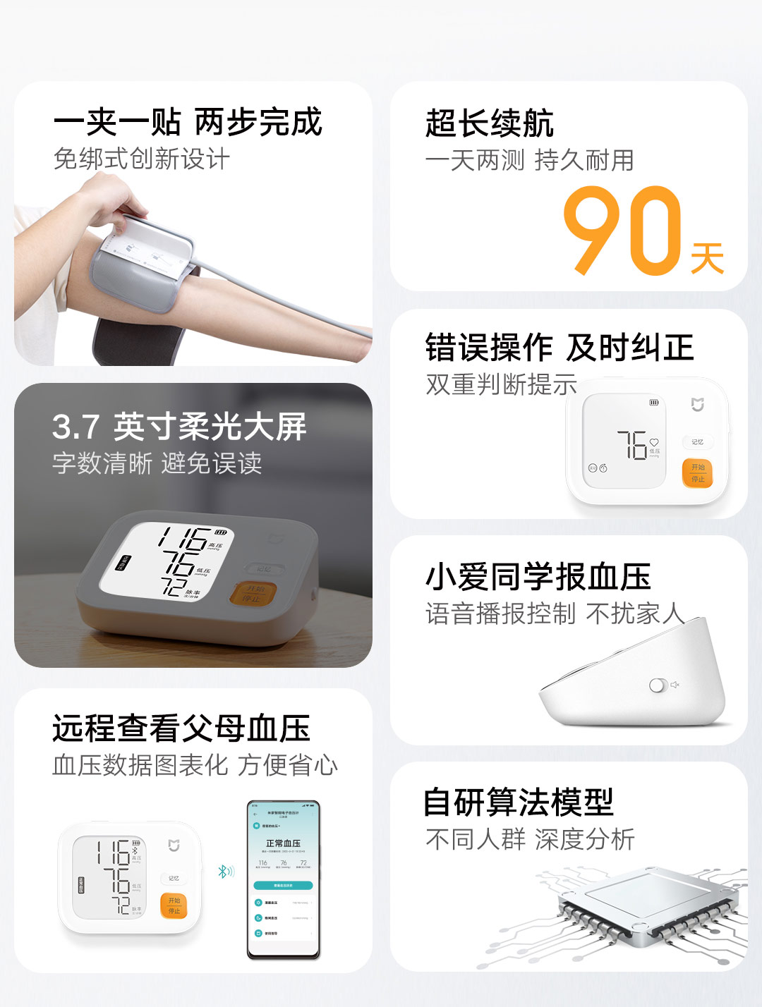 Přístroj s rozměry 136 × 106 × 61 milimetrů je vybaven 3,7″ podsvíceným LCD displejem, na kterém jsou naměřené hodnoty zobrazovány velkým písmem, což usnadňuje čtení výsledků i lidem se slabším zrakem. Zajímavostí je, podpora hlasového asistenta XiaoAI, který umí předčítat naměřené údaje, předpokládáme však, že tato funkce bude dostupná pouze v Číně.