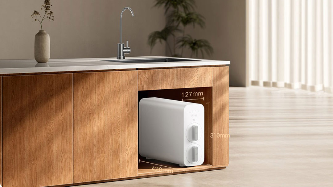 Nová chytrá čistička vody s názvem Xiaomi Mijia Smart Water Purifier N800G (produktové číslo MR872-3) už na první pohled zaujme svými relativně malými rozměry. Měří pouhých 127 × 420 × 310 milimetrů a díky tomu se bez problémů vejde i do menších kuchyňských skříněk, kde nebude zbytečně zabírat cenné místo a nebude v kuchyni působit rušivě.