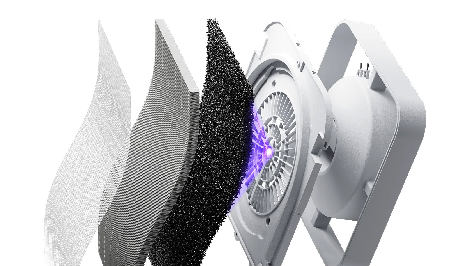 Druhá vrstva zvládne s vysokou účinností zadržet až 99,98 % částic o velikosti 0,3 mikrometru, což zahrnuje například nebezpečný polétavý prach PM2.5, spory plísní nebo částečky z cigaretového kouře. Následuje aktivní uhlí, UV světlo a generátor záporných iontů pro finální osvěžení vzduchu. Tato kombinace zajišťuje skutečně komplexní péči o vzduch.