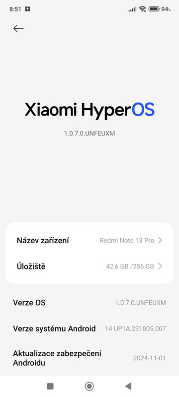 v tom případě máte evropskou (písmena EU) verzi telefonu Redmi Note 13 Pro 4G. Aktuálně je pro ni dostupná aktualizace na HyperOS 1.0.6.0.UNFEUXM s Androidem 14, vydaná 28. října. Nicméně Váš telefon nedostal ani předchozí aktualizace: