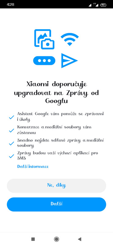 Ne není to podvod, ani vir. U globálních a evropských verzí Xiaomi a Redmi, Poco telefonů s nadstavbou MIUI  od vývojové řady 8 a výše začal výrobce Xiaomi předinstalovávat už z výroby namísto svých origo systémových aplikací „Kontakty a volání“, „Telefon“ a „Zprávy“ systémové aplikace od Google. Ty své nahradil aplikacemi Google Kontakty a Zprávy Google.  Do vývojové řady 7 včetně máme ještě aplikace pro volání a Zpravy SMS čistokrevné aplikace od Xiaomi. No a výrobce, či Google, nevím kdo to páše, nás tlačí k tomu „změnit dres“ a přejít na app Zpráv ze stáje Google, které “ jsou prý lepší“,  prostě vám je budou vnucovat tak dlouho až podlehnete. Protože můžete 1000x kliknout na to, že Zprávy od Google nechcete a to okno s přejítím na Google Zprávy tam máte záhy na displeji znova. Tohlev řeším i já na svém RN7. Zprávy od Google  (modré) nejsou lepšínež Zprávy od Xiaomi ( žluté). Nijak si jejich instalací (aktualizovánín na ně nepolepšíte) . Ale oboje tyto zmíněné aplikace převyšuje, zastiňuje svými možnostmi nastavení aplikace “ Textra SMS“ stažitelná z Google Play.