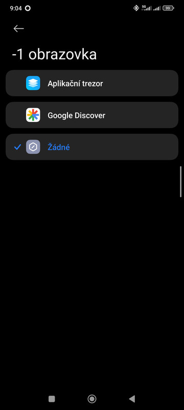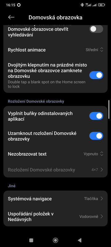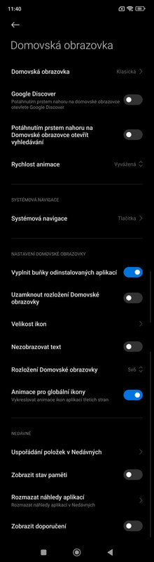 Jinak v posledním spodním řádku s ikonami (ten nad kontextovými klávesami) mohu vedle sebe umístit i šest ikon vedle sebe. Jo, a v Nastavení telefonu > Dompvská obrazovka > mám deaktivovánu položku „Google Discover“ a v prvé položce „Domovská obrazovka“ mám vybránu „Klasická“ nikoli „S nabídkou aplikací“