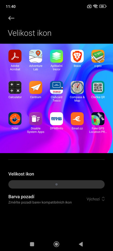 Můj druhý foun je Redmi Note 10 Pro s MIUI 14 a Adroidem 13. V tomto telefonu mám nastaveno na ploše rozložení 5×6 ikon, s tím že v položce nastavení „Velikost ikon“ mám nastavenu jejich nejmenší velikost. Při tomto nastavení mám skutečně zobrazováno pět ikon na řádku.