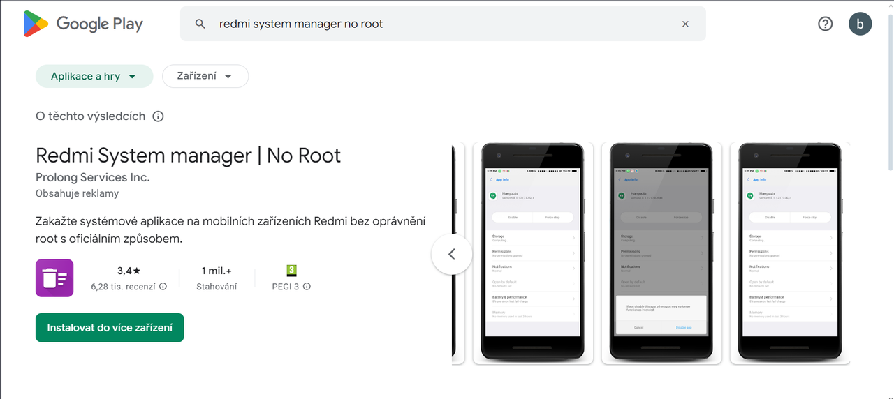 Pokud nejste, nechcete být „otrokem“ Google ,přijmout jeho diktát > „usnadnit vám co nejlépe používání telefonu“, tak lze v telefonu některé „obtěžující“ předinstalované Google aplikace (o které nestojíte) odinstalovat a další „otravné“ Zakázat. Sice nepůjdou z mobilu odinstalovat, ale umrtvíte je, nebudou vůbec pracovat a jejich ikony vám zmizí z plochy. K tomu, aby šlo aplikace Google zakázat, je třeba z obchodu Google Play stáhnout tuto aplikaci “ Redmi System manager | No Root“ od vývojáře Prolong Services Inc. (ne žádnou jinou nesoucí podobný název !!!!)