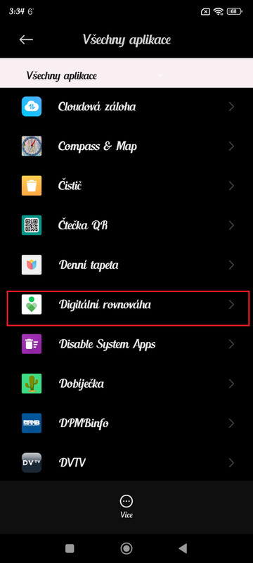 Pokračujeme k další Google aplikaci „Digitální rovnováha“ . Na tu je bohužel tato „fialová aplikace“ krátká a nepůjde deaktivovat, zakázat.