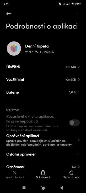 Nastavení telefonu > Aplikace > Správa aplikací > kkiknout na tři tečky v pravém horním roku > v nabídce možností vyberte „Zobrazit všechny aplikace“ > nyní v seznamu aplikací seřazených abecedně pod sebou nalezněte app „Denní tapeta“ >rozklikněte ji (Podrobnosti o aplikaci) > uprostřed dole klikněte na „Odinstalovat“.