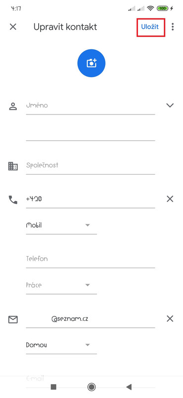 Poté co kontakt zeditujete, jeho změnu uložíte klknutím na červeně označenou „fajfku“ v pravém horním rohu editovaného kontaktu >