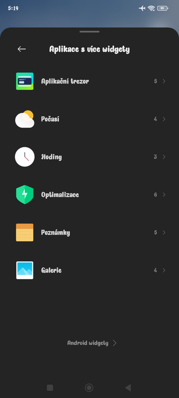V této nabídce dole klikněte na „Android widgety >“ a záhy se ocitnete v původní, té vámi známé klasické nabídce widgetů.