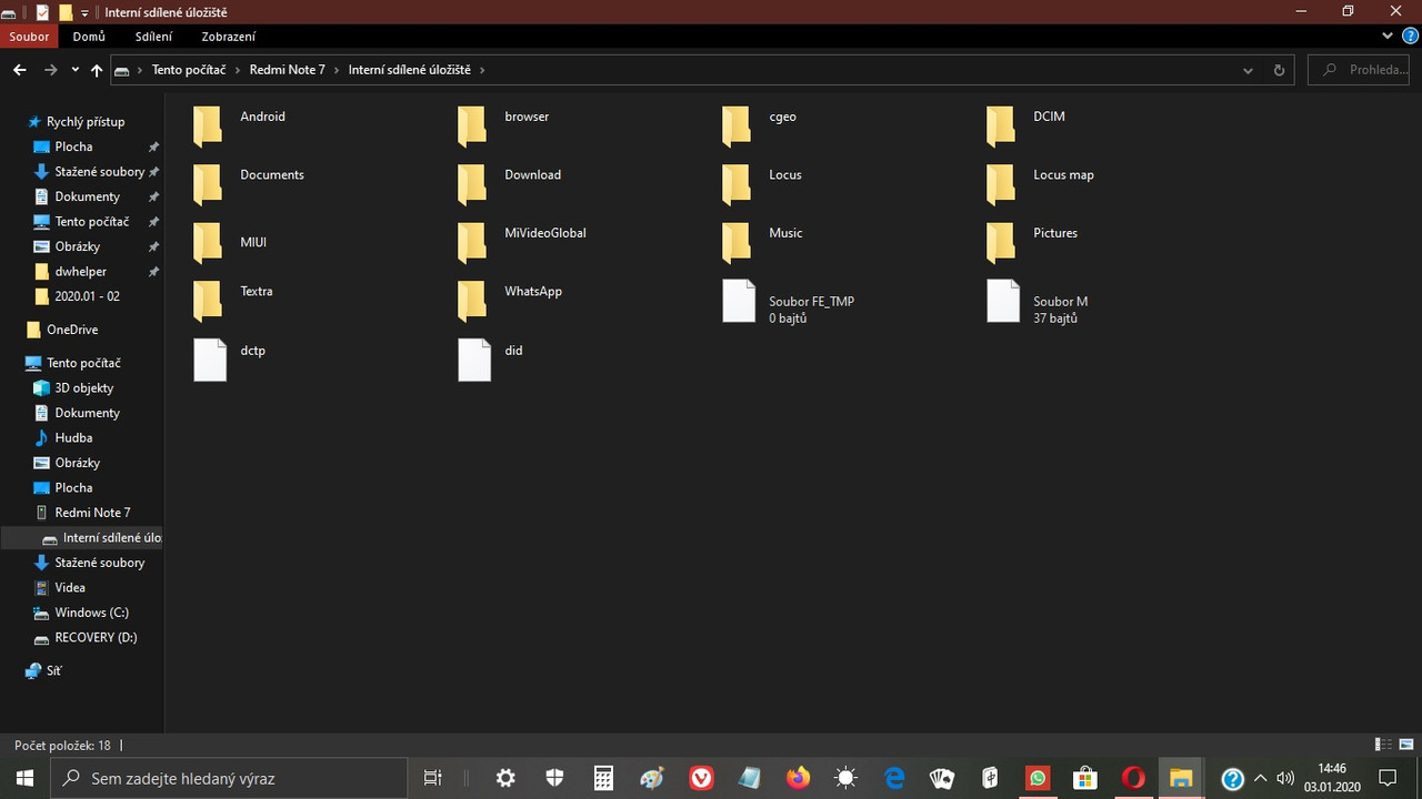 Než začnete propojovat kabelem (od mobilu) PC se samotným mobilem, tak je třeba míti mobil odemčen. Odemklou obrazovku (PINem; Gestem; Otiskem prstu) . Pokud totiž propojíte zamknutý mobil s PC, tak v PC Správci souborů uvídíte pouze prázdné interní uložiště RN7. Tento jev je přičten zabezpečení telefonu. To kdyby vám někdo ukradl founa a chtěl se v něm šťourat, ve vašich osobních složkách, tak mu to bude bez odemknutého telefonu (PINem, Gestem, Otiskem prstu) znemožněno a uvidí v PC pouze to prázdné uložiště telefonu. (viz přiložený screenshot)