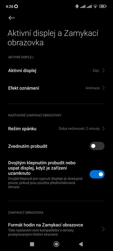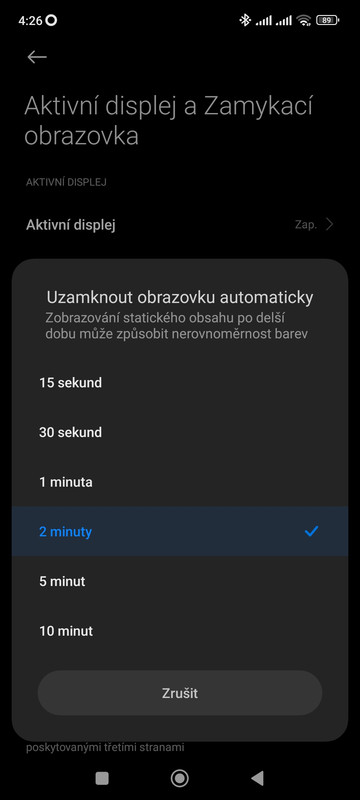 Vlezete do Nastavení telefonu > Aktivní displej a Zamykací obrazovka > sekce NASTAVENÍ ZAMYKACÍ OBRAZOVKY ( psáno šedě) > Režim spánku > Uzamknout obrazovku automaticky po: 15s * 30s * 1min. * 2min. * 5min. * 10min.