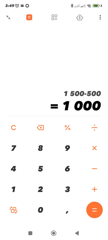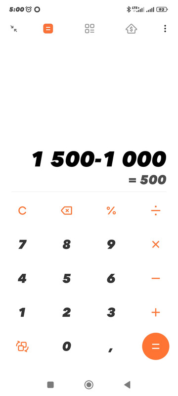Divám se na zobrazené prostředí tazatelovy kalkulačky a má jiné než mám já (12.3.81) > viz horní lišta. A tak jsem z apkmirror stáhl zcela aktuální verzi 15.0.22 Mi Calculator a tu svoji stávající kalkulačku aktualizoval. Nyní mám v horní liště stejně jako tazatel přepínání Kalkulačka / Převodník. Opět jsem v RN10 Pro zadal kalkulačce výpočet 1500-1000= 500 a jak na widgetu kalkulCce, tak v samotné app systémové kalkulačce (v15. 0.22) opět dva korektní výsledky 500. Nikde žádná vyskakující desetinná čárka.