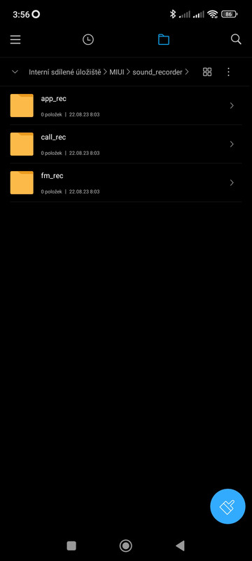 Ve svém příspěvku píšete, že ve Správci souborů > Interní sdílené uložiště > žlutá složka „MIUI“ > žlutá složka „sound_recorder“ > tuto složku složku jste rozklikla a uviděla jste tam tři podsložky. Ani v jedné z nich nejsou vidět uložené nahrávky pořízené Záznamníkem. To je skutečnost. Nevidím tam uloženy ani ty své tři nahrávky. Skutečně ve složce sound_recorder a jeho podsložkách nahrávky pořízené Záznamníkem nenajdete.