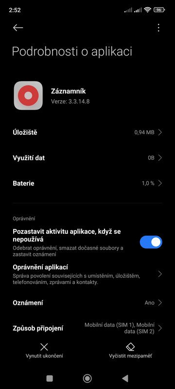 Z „Podrobnosti o aplikaci“ (tohoto Záznamníku) je na na spodu napsáno „Vynutit ukončení“ a napravo „Vyčistit mezipaměť“. Pokud by šla aplikace skutečně, reálně odinstalovat, tak by byla tato možnost ‚Odinstslovat“dole uprostřed vidět. Tato možnost tam není, jelikož je to systémová aplikace, pevná součást nadstavby MIUI. Pokud byste klikla na „Vyčistit mezipaměť“, tak tato volba nemá vliv na uložené nahrávky tohoto Záznamníku. Ty jsou netknuty i po vyčištění mezipaměti, stále zůstávají v telefonu s možností přehrátí, ale pouze z prostředí otevřené aplikace Záznamníku. (viz screenshot – mé tři nahrávky pořízené záznamníkem)