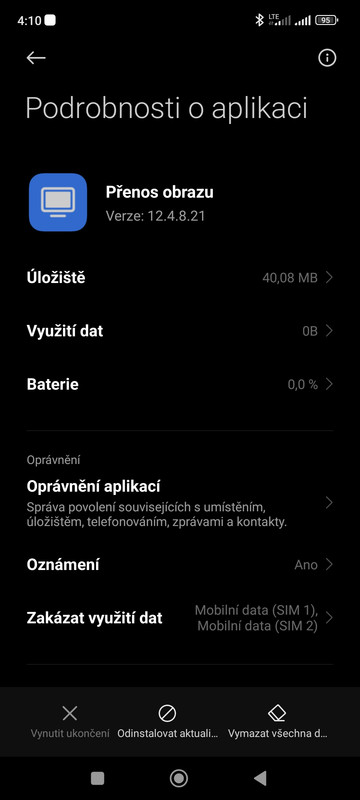 Vy kliknete na položku „Vymazat všechna data“  a opravdu dáte vymazat všechna data ( né jen mezipaměť).  Tímto krokem si aplikace přestane pamatovat,  co jste s ní kdy učinil.  Tedy zapomene na to,  že jste ignoroval její aktualizaci.  A jako druhý krok kliknete na tu prostřední možnost „Odinstalovat aktualizace“ .  Poté vám za nějaký čas opět v „Aktualizace systémových aplikací“  vyskoči notifikace, že si aplikace Přenos obrazu přeje aktualizaci.  Jen ji nesmíte zas ignorovat. 😀