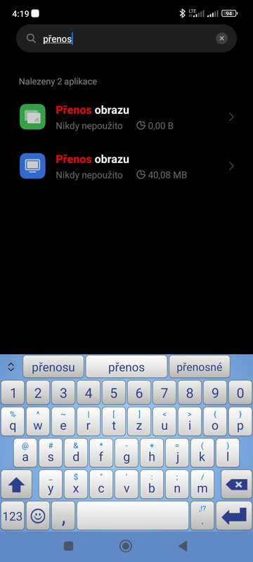 Nyní do vyhledávacího pole vypište „Přenos obrazu“  (pochopitelně vy slovensky :D)  Pozor zobrazí se vám tam zřejmě dvě aplikace stejného názvu.  Vy zvolíte tu s modrou ikonou.