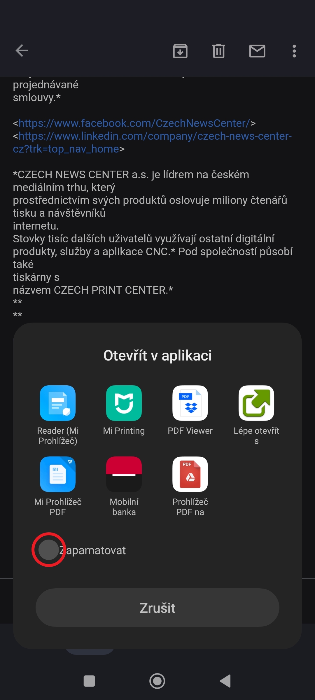 bohužel se mi nezobrazují obrázky, nicméně to nijak zásadně nevadí. Zkusil jsem to nyní na telefonu Xiaomi 12 s MIUI 14 a Androidem 13. Po otevření přílohy ve formátu PDF z Gmailu se mi nabídne seznam aplikací. V jeho spodní části mám zatržítko Zapamatovat. Na Vašem telefonu tuto možnost nemáte?
