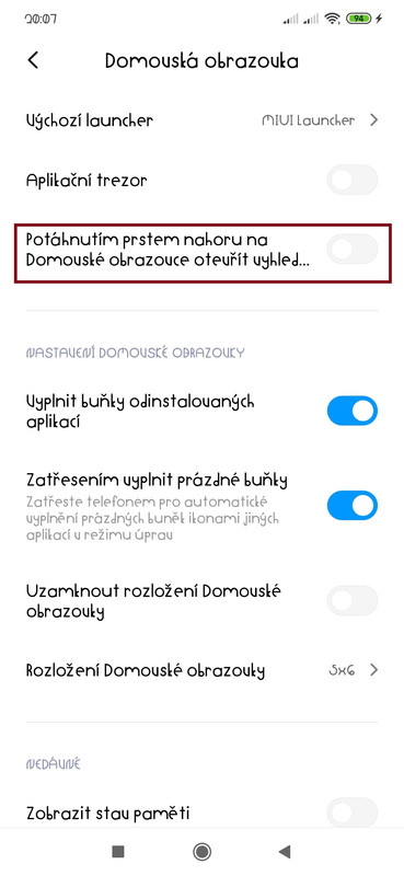 Pokud nechcete, aby při tažení prstu od spodního okraje displeje vám vyskakovala lupa s Xiaomi prohlížečem, respektive aby se nedělo nic při tažení prstu od spodního okraje, tak vlezte do Nastavení > Domovská obrazovka a tam deaktivujte položku (funkci) „Potáhnutím prsttem nahoru na Domovské obrazovce otevřít vyhled…..“  (zesvětlalý přepínač) viz screenshot