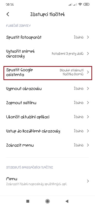 Další věcí, která může býti otravná je to, když máte na kontextovém, prostředním tlačítku „Domů“  ( Menu – Domů – Zpět) , při jeho dlouhém podržení nastavenu funkci „Spustit Google asistenta. Stačí se chvíli na tlačítku Domů „zapomenout“ a hned se vám spustí Google vyhledávání  plus s Počasím a Zprávami. Pokud ani toto nechcete, tak opět se vnořte do Nastavení > Další nastavení > Zástupci tlačítek > Spustit Google asistenta > a tu zrušit volbu spouštění dlouhým podržením tlačítka Domů a nezvolit buď nic (Žádná) nebo volbu spouštění Google asistenta přesměrovat na jiná tlačítka.
