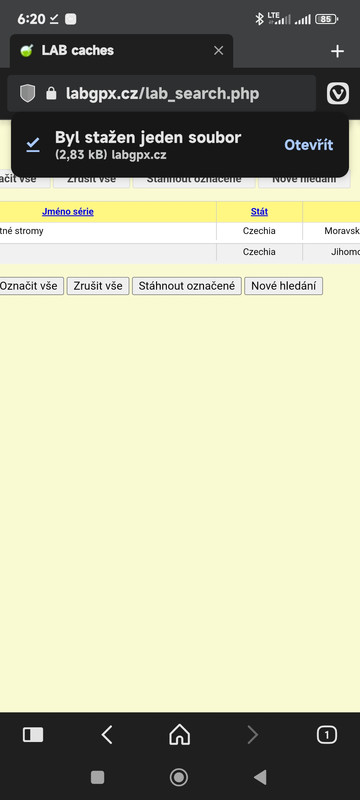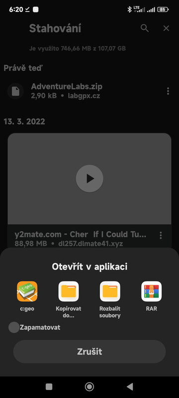 Jiná věc je tato v případě např geocachingu. Prohlížečem si ze stránek labgpx.cz stáhnu Labku.zip a po stažení ji nechám rovnou z prohlížeče Otevřít (a nebo ve Správci souborů ze složky „Download) . Jelikož nemám žádnou app prioritně (výchozí) nastavenou pro rozbalování zaZIPlejch souborů, tak mi mobil nabídne toto :
