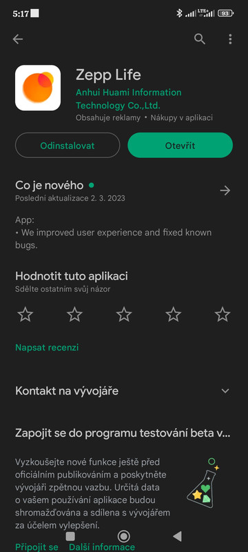 Zkusila jsem reinstall ZeppLife a nepomohlo. K tomu při pokusu o připojení hlásí problém s bluetooth a nutností jeho restartu.