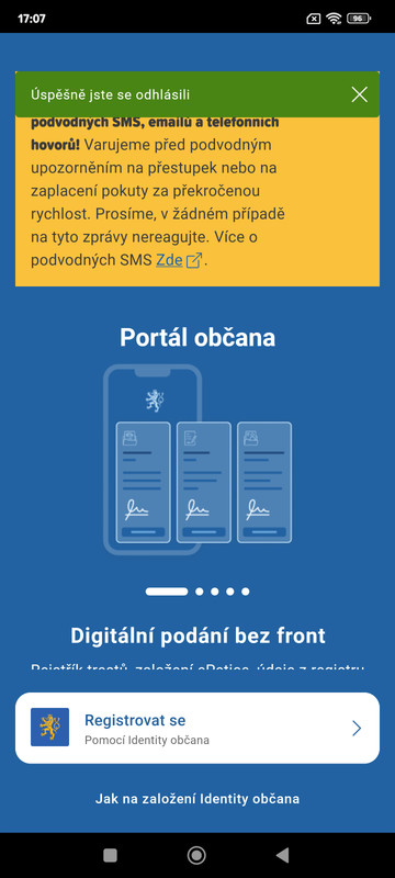 Cvičně zkouším tuto aplikaci instalovat z Google Play na Redmi Note 10 Pro EEA (MIUI14/A13) a POCO F5 Pro EEA (HyperOS 1.0/A14). Na obou telefonech se aplikace chová stejně. Na úvodní obrazovce aplikace v horní části displeje vyskočí zelená hláška „Úspěšně jste se odhlásili“. Kliknout na okno „Registrovat se“ jde a vyskočí obrazovka s možnostmi přihlášení se (způsoby) na Portál občana.