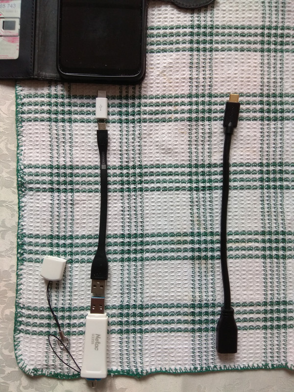 Ten kabel mne hned nenapadl, ale přispěji i trochu jinak. Zjistil jsem zcela nenáhodnou, ale naopak „tvrdou“ závislost délky kabelu a doby nabíjení. Vůbec tomu nerozumím, protože se mi nechce věřit, že zkrácení kabelu na speciální, 15 cm dlouhý, kablík od adaptéru k MT (ten samostatný černý vpravo na obrázku), mělo neskutečný vliv na dobu nabíjení. Kabelů mám celou řadu, tak jsem si chvíli „hrál“ a zmíněná vlastnost vůbec není náhodná. Takže kdykoliv připustím, že se opravdu mohou dít věci. V souvislosti s OTG, o kterém se zde teď hlavně jedná, jenom přidám, že jsem zkombinoval spojení pro připojení flashky k MT, které vůbec nefungovalo, ač by mělo, viz obrázek (přerušovaný had vlevo).