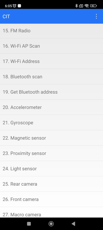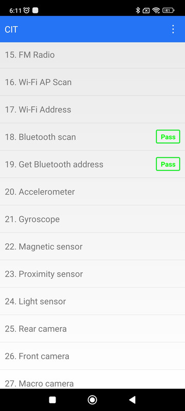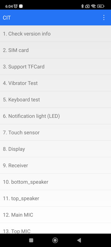 Vlezte do nastavení telefonu > O telefonu > Detailní informace a specifikace > Verze jádra > na tuto položku budete opakovaně ťukat prstem a přitom vám bude v bublině vyskakovat hláška „Ještě 3,2,1 krok od vstupu do CIT“ Nakonec se vám tento test mod sám otevře .Jeho prostředí vypadá takto a 18té  a 19té pozici jsou dvě položky k otestování bluetoothu a to „Bluetooth scan“ a „Get Bluetooth address“. Stačí na tu první položku (18) kliknout a nic nedělat.Test probíhá automaticky funkce po funkci. Pokud test ukáže, že Bluetooth správně funguje, pak u obou těchto položek uvidíte zeleně psané „Pass“ Pokud uvidíte červené psané „Fail“, pak s funkcí Bluetooth bude něco v nepořádku.  Pokud budete chtít proskenovat všechny funkce telefonu, tak začněte od jedničky. U některých funkcí to bude  chtit třeba naklápět mobil do všech strany (osy x,y,z), nebo u Proximity sensor zakrývat displej dlaní (při odkrytém displeji vidite hodnotu 5.0 a když displej zastíníte dlaní tak hodnota padne na 0.0 .Po odkrytí vyleze opět na 5.0. Toto je jeho správná funkce ) U některých položek, kde test proběhl OK, tak vám dole vlevo dole zmodrá jinak zešedlé „Pass“ .Na to kliknete a posunete se k testu další funkce. Ale to jsem už moc odběhl.