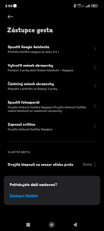 Nastavení > Další nastavení > Zástupce gesta > VLASTNÍ GESTA (šedě) > Dvojité klepnutí na senzor otisku prstů > ve výběru, možnostech, v aktivaci vlastního gesta je také „Zapnout svítilnu“
