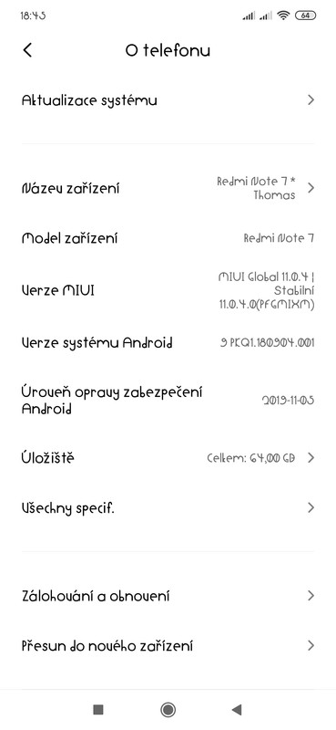 …..jak to popisujete, tak vám musela aktualizace přicestovat do mobilu „vzduchem“ přes OTA. Hlavně se podívejte, zda tu aktualizaci MIUI Global Stabilní ve verzi 11.0.4.0 (PFGMIXM) máte v Redmi Note 7 skutečně nainstalovanou. Poznáte to takto: Nastavení > O telefonu a tam musíte vidět toto (viz screenshot)