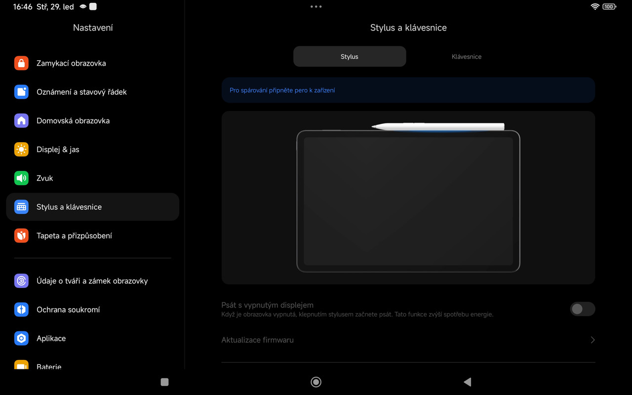 na Xiaomi PAD 6 je v Nastavení tabletu položka Stylus a klávesnice > a možnost spárovat s tabletem stylus a přídavnou klávesnici, která je součástí obalu, krytu tabletu. Pro spárování stylusu s tabletem je na horní hraně ploška s magnetem, ke kterému se stylus „přicvakne“  (viz Pro spárování připněte pero k zařízení) A pro připojení spárování klávesnice jsou na zadní straně tabletu 3 piny V okamžiku jak se přicvakne k tabletu obal s klávesnicí, tak se piny propojí s piny klávesnice na obalu a dojde k procesu spárování.