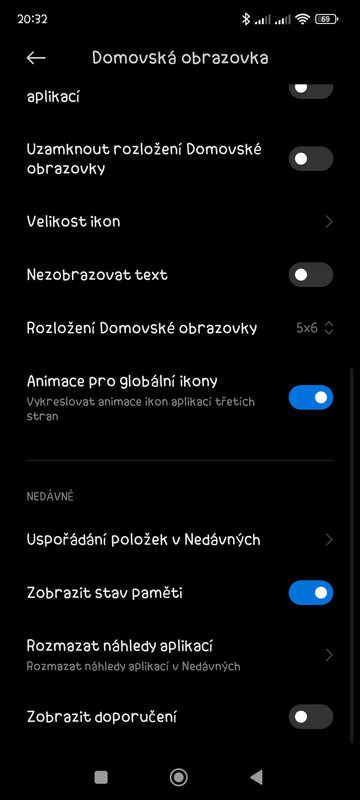Vlezte do Nastavení telefonu > Domovská obrazovka > Dole sekce „NEDÁVNÉ“ (psáno šedě) > Zobrazit stav pamětí > aktivovat (zmodralý přepínač)