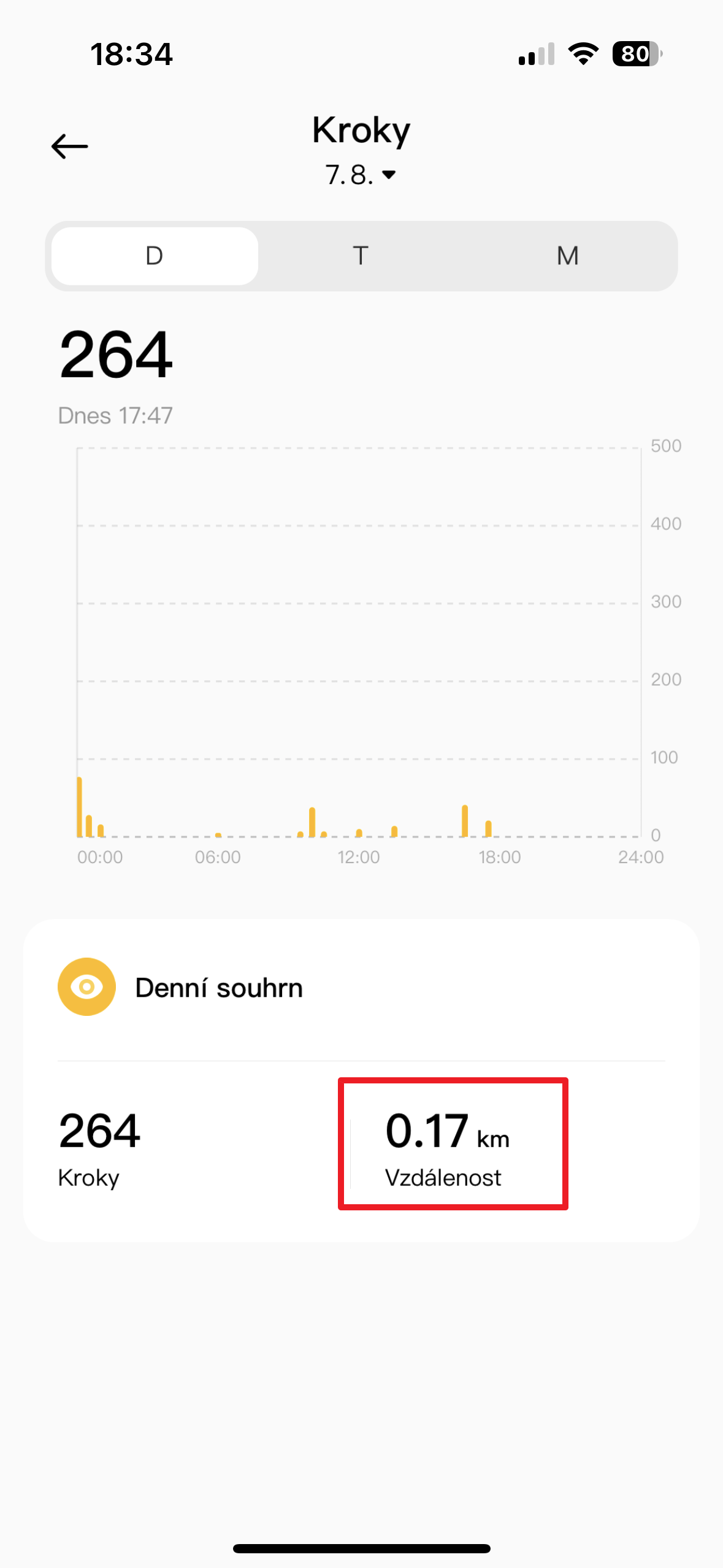 v aplikaci najdete vzdálenost v kilometrech tak, že klepnete na dlaždici zobrazující počet kroků v průběhu dne. Na další obrazovce se pak ukazuje přepočet na kilometry.