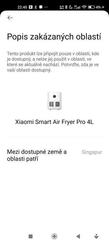 Pokud postupuji podle průvodce (v Mi Home), nabidne mi to připojení k Wifi fritézy, to udělám. Skenování nic nenajde (s textem že to nelze použít v oblasti, kde se právě nachází) – pak se dole objeví podobná nalezená zařízení v okolí s textem „popis zakázaných oblastí“ … a dole že například mezi dostupné země a oblasti patří Singapur !!